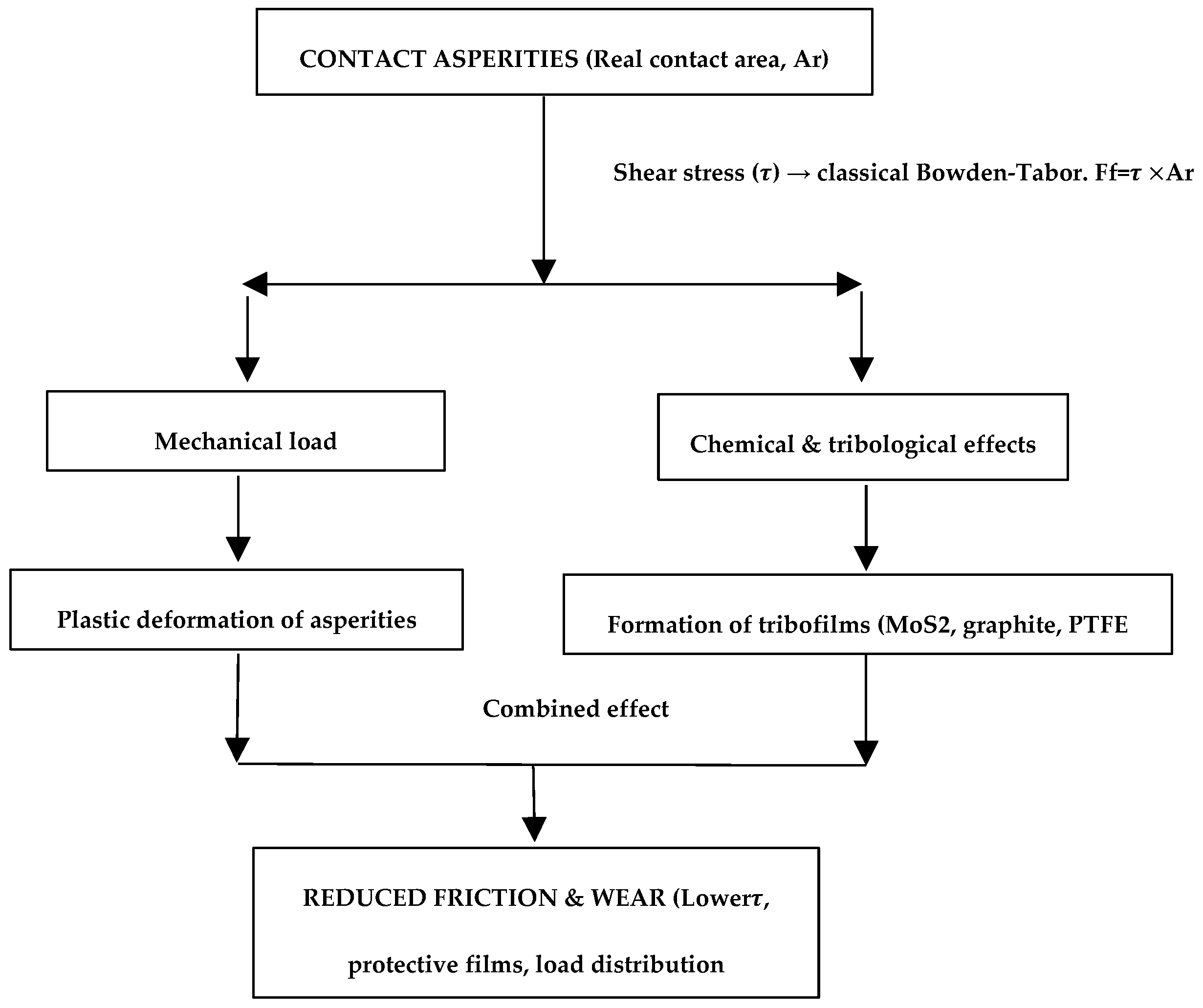 Mechanistic representation of friction in Ni-based composite coatings: integration of Bowden–Tabor shear-based friction, mechanical deformation of asperities, and tribofilm formation by MoS2, graphite, and PTFE.
