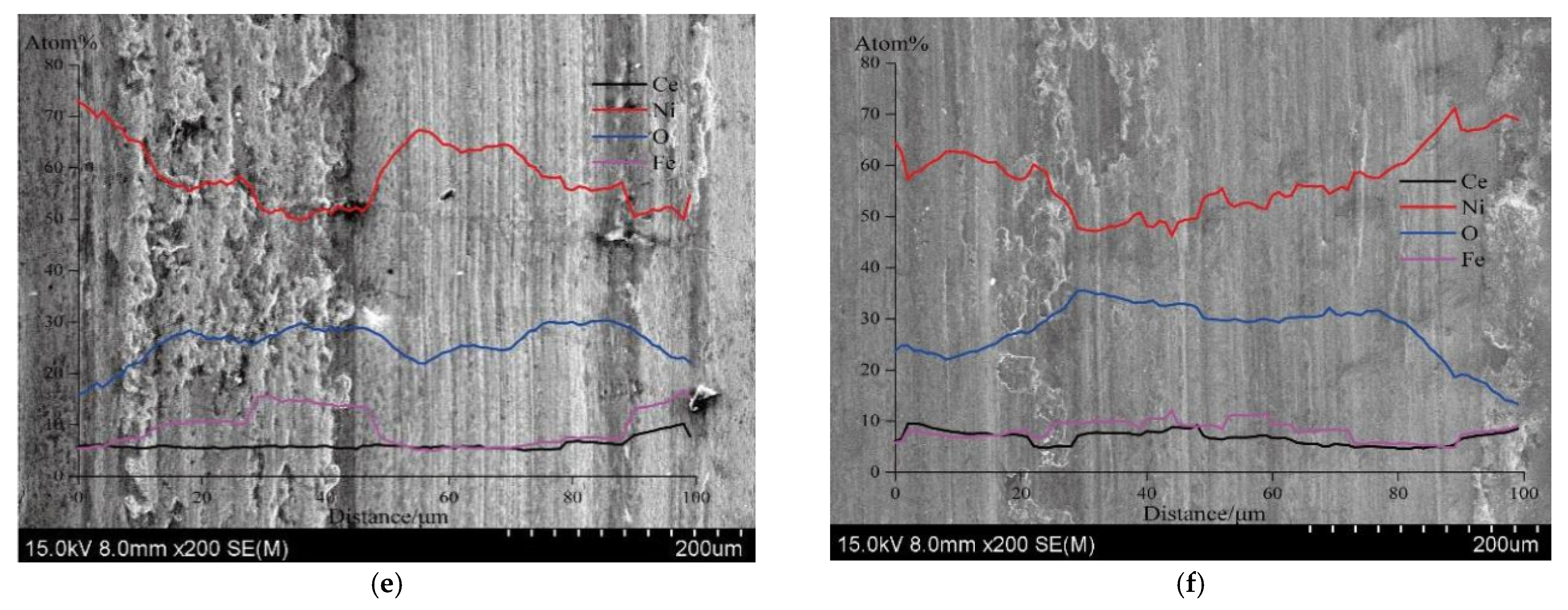 To reduce the negative impact of surface flaws in coatings caused by CeO2 nanoparticle aggregation, R. An-hua et al. (2021) [25] employed the jet electrolytic deposition method. In order to achieve Ni-CeO2 composite coatings at varying current densities, they applied a vertical magnetic field during the jet electrolytic deposition procedure. The results demonstrate that the magnetic field’s magneto-hydrodynamic action results in the regularly arranged particles of the composite coatings. As the current density rose, the microhardness, corrosion resistance, and wear resistance first increased but subsequently declined. With a microhardness value of up to 665.78 HV and high surface density and flatness, the composite coating was created at a processing current density of 20 A/dm2. Additionally, it showed the highest level of wear resistance.