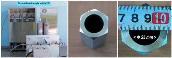 Industrial-grade methane (Grade 2, approximately 99% purity) was used as the test gas. This grade has been widely employed in previous hydrate experiments and gas-dispersion studies and provides sufficient accuracy for evaluating relative concentrations relevant to explosion-safety assessments [16]. The flow rate was controlled using a mass flow controller (MFC) with a specified accuracy of ±1% full scale (FS), according to the manufacturer’s specifications and in accordance with ISO 6145-7 [17].