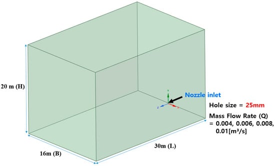 The computational domain was modeled to match the experimental chamber: a fully enclosed volume of 16 m (B) × 30 m (L) × 20 m (H), with gravitational acceleration applied in the vertical direction and no background ventilation. As illustrated in Figure 6, the internal 3D geometry of the chamber was reconstructed to define the flow region.
