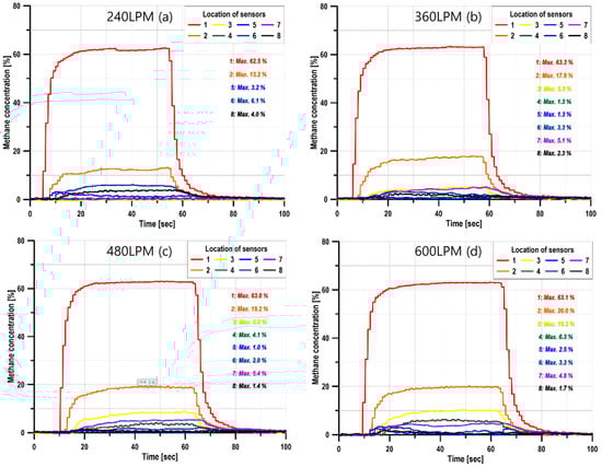 It should be noted that the methane release duration of 30 s was selected to resolve the transient dispersion behavior and sensor response characteristics during the early-stage leakage phase. Preliminary observations confirmed that the primary jet structure, plume centerline development, and LEL (5%) reach were established within this time window for all flow-rate conditions considered.