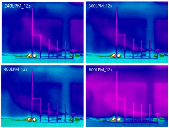 In the main experiment, four flow-rate conditions ranging from 240 to 600 LPM were evaluated. The configurations of the sensor networks and the detailed test conditions are summarized in Table 1 and Table 2.
