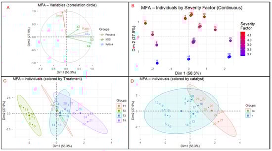 (A) Correlation circle showing the associations between process variables (Time, Severity Factor, solid-to-liquid Ratio) and product groups (xylose and XOS). (B) Individuals plotted by Severity Factor, illustrating the gradient of hydrolysate composition along Dim1. (C) Individuals grouped by treatment (T1–T4), evidencing the influence of process intensification and citric acid addition. (D) Individuals grouped by catalyst, highlighting the separation between citric-acid-catalyzed (ca) and non-catalyzed (n) samples.