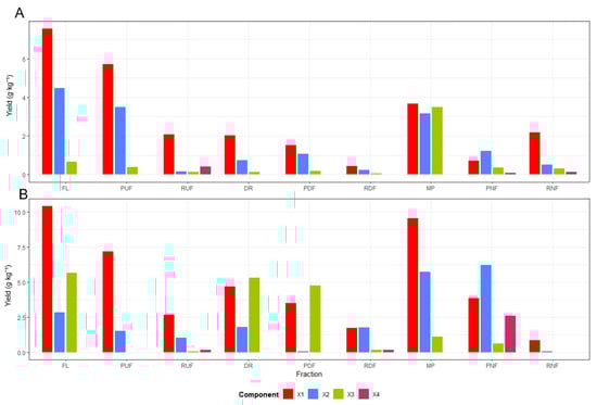 For the citric-acid-assisted hydrolysate (T4), a markedly different compositional behavior was observed compared to the non-acidic treatment. The liquid fraction (FL) and the UF retentate (RUF) exhibited similar proportions of xylose (X1) and xylobiose (X2), whereas the diafiltration step (PDF–RDF) substantially enhanced the recovery of medium-chain oligomers particularly in the RDF fraction, where xylobiose (X2) reached ≈2.0 g·kg−1 (dry biomass basis). This trend suggests that mild acid catalysis promoted partial and selective depolymerization of hemicellulose, generating oligomers with a degree of polymerization between 2 and 3 that were efficiently retained and concentrated during DF.