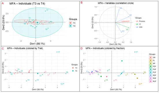 To further analyze the characteristics of the membrane filtration process, a Multiple Factor Analysis (MFA) was carried out to integrate the process parameters and response variables obtained from the hydrothermal treatments (T3 and T4). The data matrix included three groups of variables: (i) process parameter (reaction volume), (ii) feedstock composition (X1), and (iii) response variables related to XOS production (X2–X4). Each group was normalized and equally weighted to ensure balanced contributions to the factorial structure.