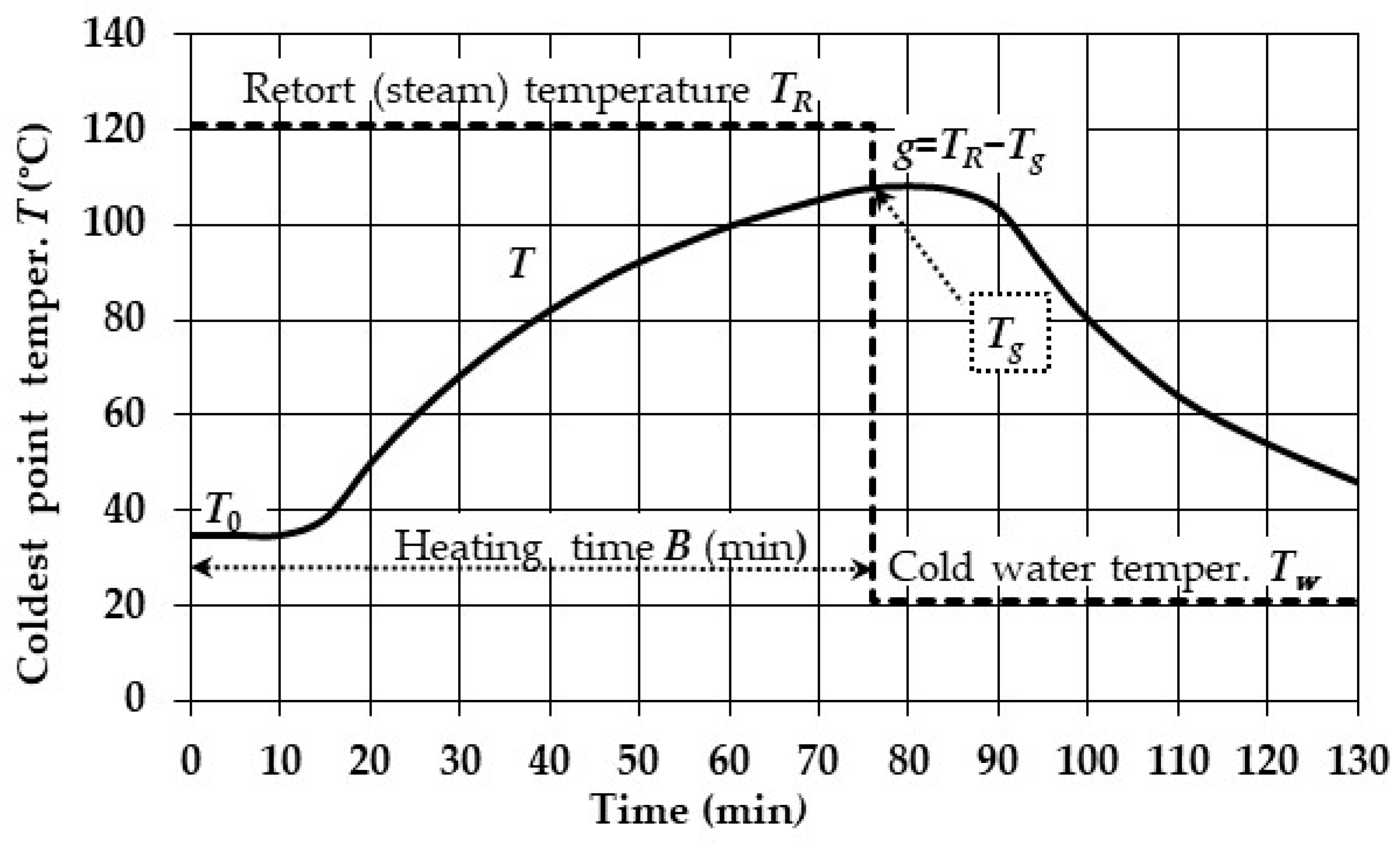 where t c   (min) is the cooling time with the origin at the cold-water-on (and steam-off); T g is the temperature of the critical point (coldest point of the canned food) at the steam-off; k was determined in [44] as the following equation: