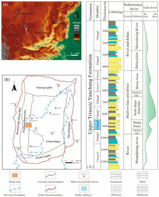 - Liu, H.; Li, X.; Wan, Y. Palaeogeographic and sedimentological characteristics of the Triassic Chang 8, Ordos Basin, China. Acta Sedimentol. Sin. 2011, 29, 1086–1095. [Google Scholar] [CrossRef]