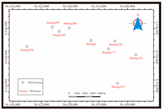 Well locations in the study area. Note: The horizontal and vertical coordinates in this map refer to the Gauss–Krüger plane rectangular coordinates (unit: meter).