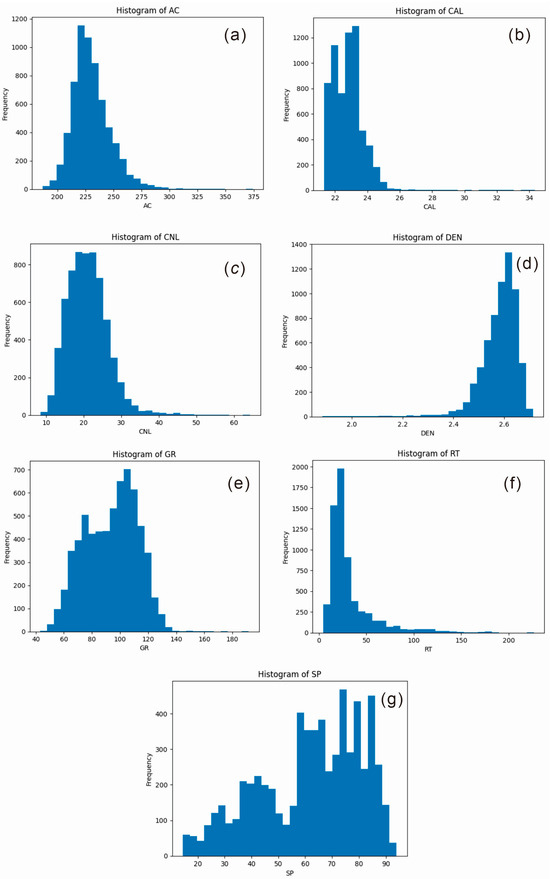 Data distribution characteristics of well-logging response parameters: (a) AC; (b) CAL; (c) CNL; (d) DEN; (e) GR; (f) RT; (g) SP.