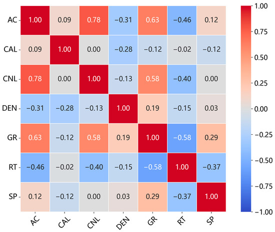 This dataset comprises data from 9 wells, encompassing a total of 6409 samples with a sampling interval of 0.125 m. All data were initially labeled by experienced technical personnel and subsequently validated by multiple domain experts, ensuring the reliability and scientific rigor of the dataset. This high-quality dataset provides a solid foundation for model development and evaluation. Figure 3, Figure 4, Figure 5, Figure 6, Figure 7, Figure 8 and Figure 9 show boxplots of the data distributions for different well-logging response parameters. Figure 10 shows the data distribution characteristics of well-logging response parameters. Table 2 presents the statistical characteristics of the different well-logging response parameters. To assess redundancy and complementarity among the seven input features, we calculated the Pearson correlation coefficient matrix (Figure 11).