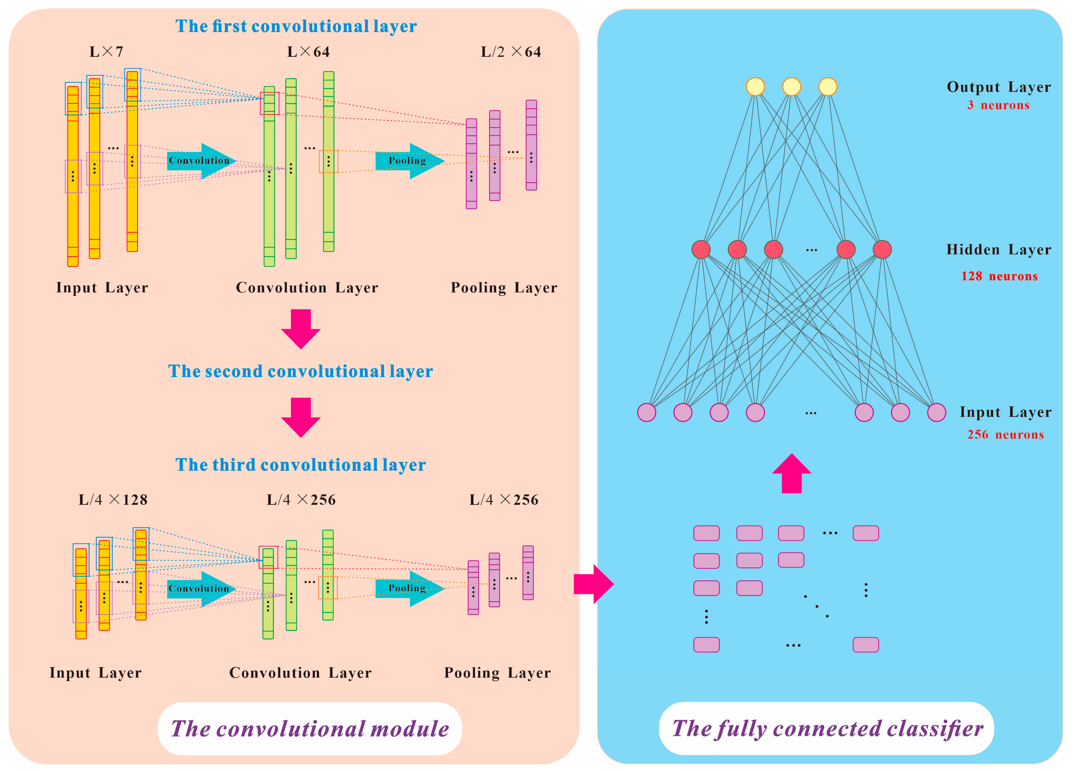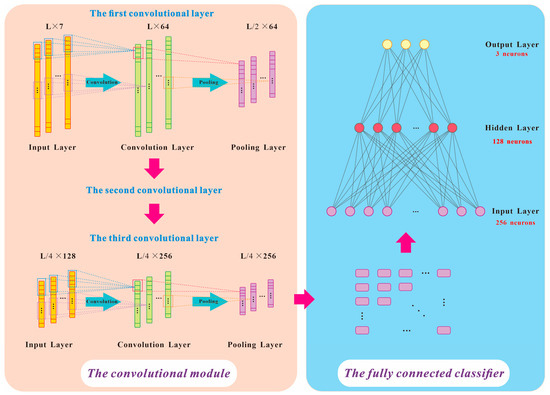 In a CNN, one or more fully connected layers are typically added after several groups of convolutional and pooling layers. All neurons from the preceding layer are fully connected to those in the fully connected layer, integrating key local features with strong class-discriminative ability extracted from the convolution–pooling groups. The output layer then receives the outputs from the final fully connected layer and normalizes these outputs via the Softmax function (to convert them into a probability vector) so that the resulting values fall within the range [0, 1], as shown in Equation (3).