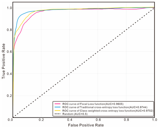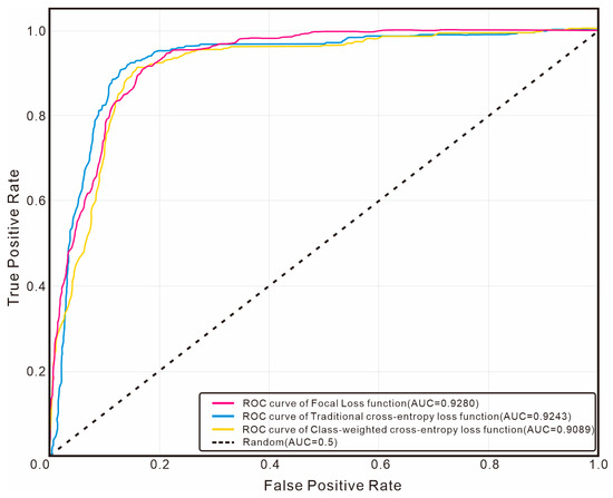 In terms of oil-bearing layer identification, the AUC value of Focal Loss is 0.9280, which is slightly higher than that of traditional cross-entropy loss (0.9243) and significantly higher than that of class-weighted cross-entropy loss (0.9089). This indicates that through its dynamic modulation mechanism, Focal Loss effectively enhances the model’s attention to the key minority class, enabling it to perform better in the oil-bearing layer identification task. In the micro-average ROC curve, traditional cross-entropy loss achieves the highest AUC value (0.9744), which is higher than that of Focal Loss (0.9605). This reveals that traditional cross-entropy tends to optimize the overall accuracy, while Focal Loss focuses on improving the identification ability of the minority class.