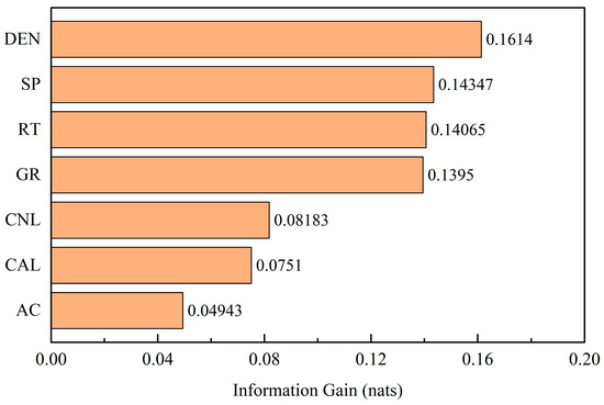 Sensitivity analysis plays an important role in quantifying the influence of each input parameter on the model outputs, helping to identify the most effective features and guiding model interpretation and optimization. For instance, Jolfaei and Lakirouhani [36] employed the cosine amplitude method (CAM) in conjunction with a neural network to conduct sensitivity analysis on the parameters affecting borehole breakout dimensions. In this study, we adopted the concept of sensitivity analysis and implemented it using mutual information to measure the dependency between each well-logging parameter and the target variable (reservoir type). A higher mutual information value indicates that a feature contains more target-related information and thus has a stronger impact on the model. To identify key well-logging parameters, we calculated mutual information scores between each feature and the target, and the calculation results are shown in Figure 20.
