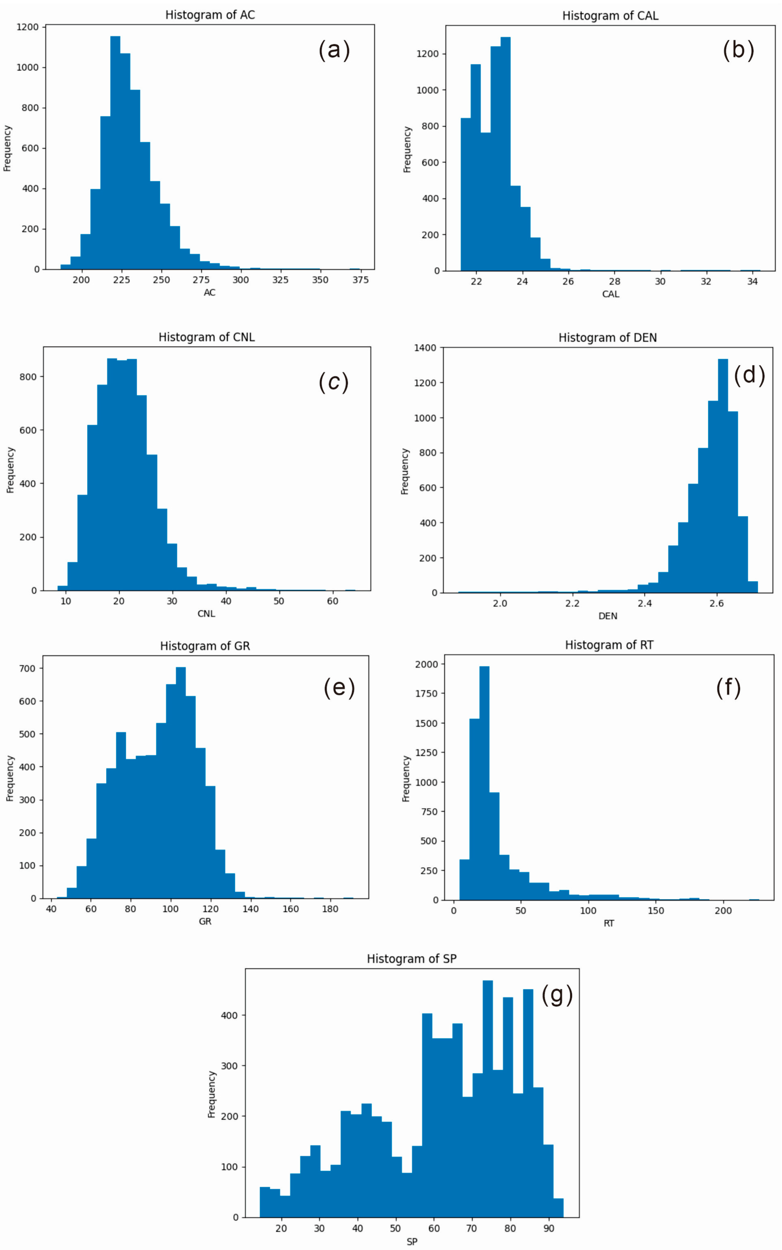 To comprehensively characterize reservoir lithology, pore structure, and fluid properties, nine commonly used well-logging curves were selected as input features. These include acoustic time difference (AC), compensated neutron log (CNL), natural gamma ray (GR), spontaneous potential (SP), true resistivity (RT), bulk density (DEN), and caliper log (CAL), among others. These parameters collectively capture reservoir porosity, hydrogen content, lithological variation, permeability, and fluid characteristics, offering multidimensional and complementary information for the model. In particular, parameters such as RT, CNL and DEN exhibit significant variations across different fluid types, thereby enhancing classification discriminability.
