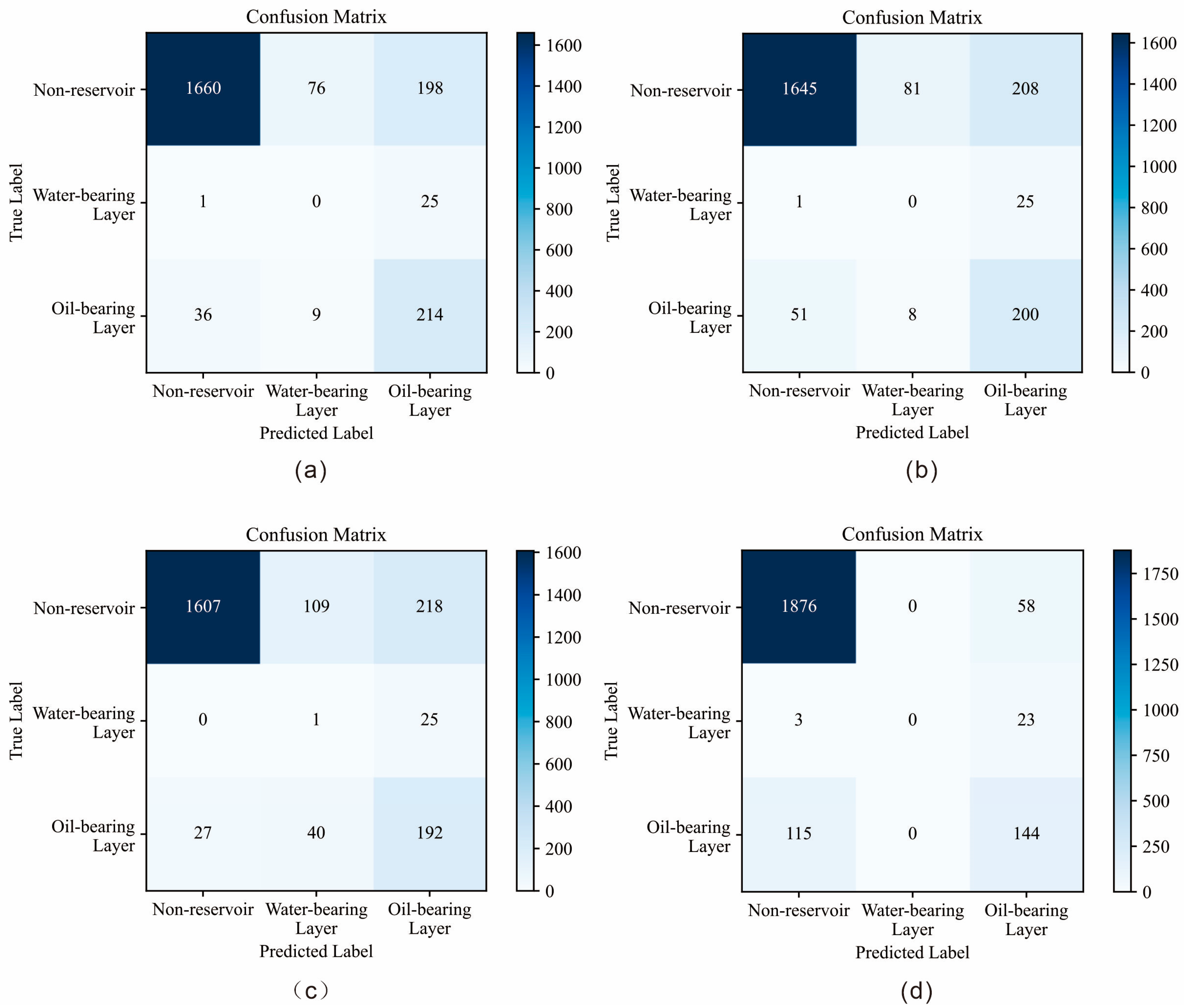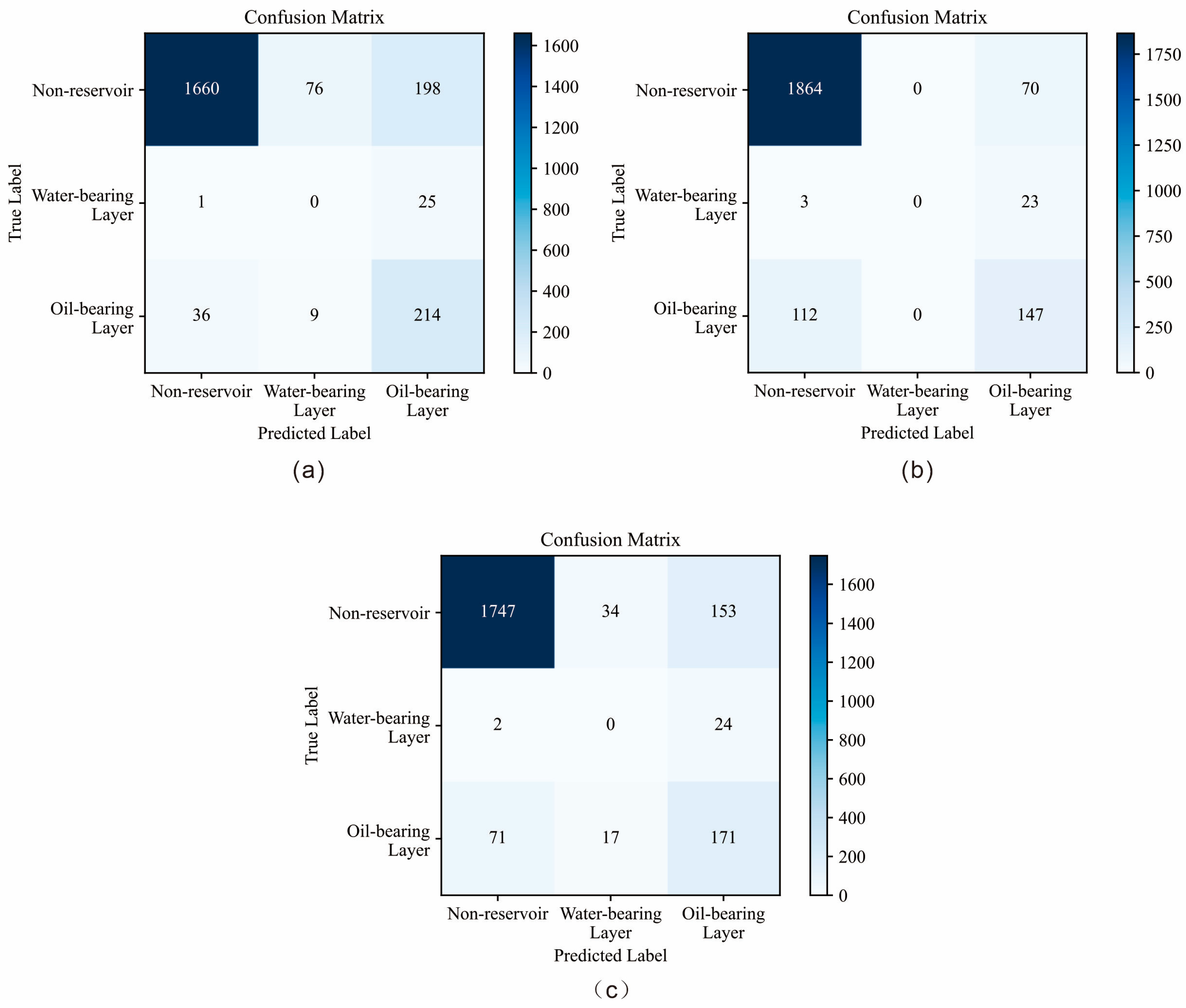 The confusion matrix is a critical tool for evaluating the performance of classification models, particularly in binary and multiclass tasks. It presents the alignment between the predicted and actual outcomes in a matrix format, providing a comprehensive representation of the model’s classification performance and its behavior across different categories. Typically, the confusion matrix is an n × n matrix, where n denotes the number of classes. In this study, there are three categories: The oil-bearing layer, the water layer, and the non-reservoir.
