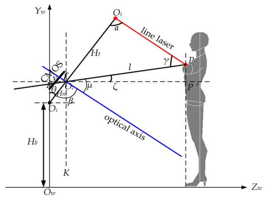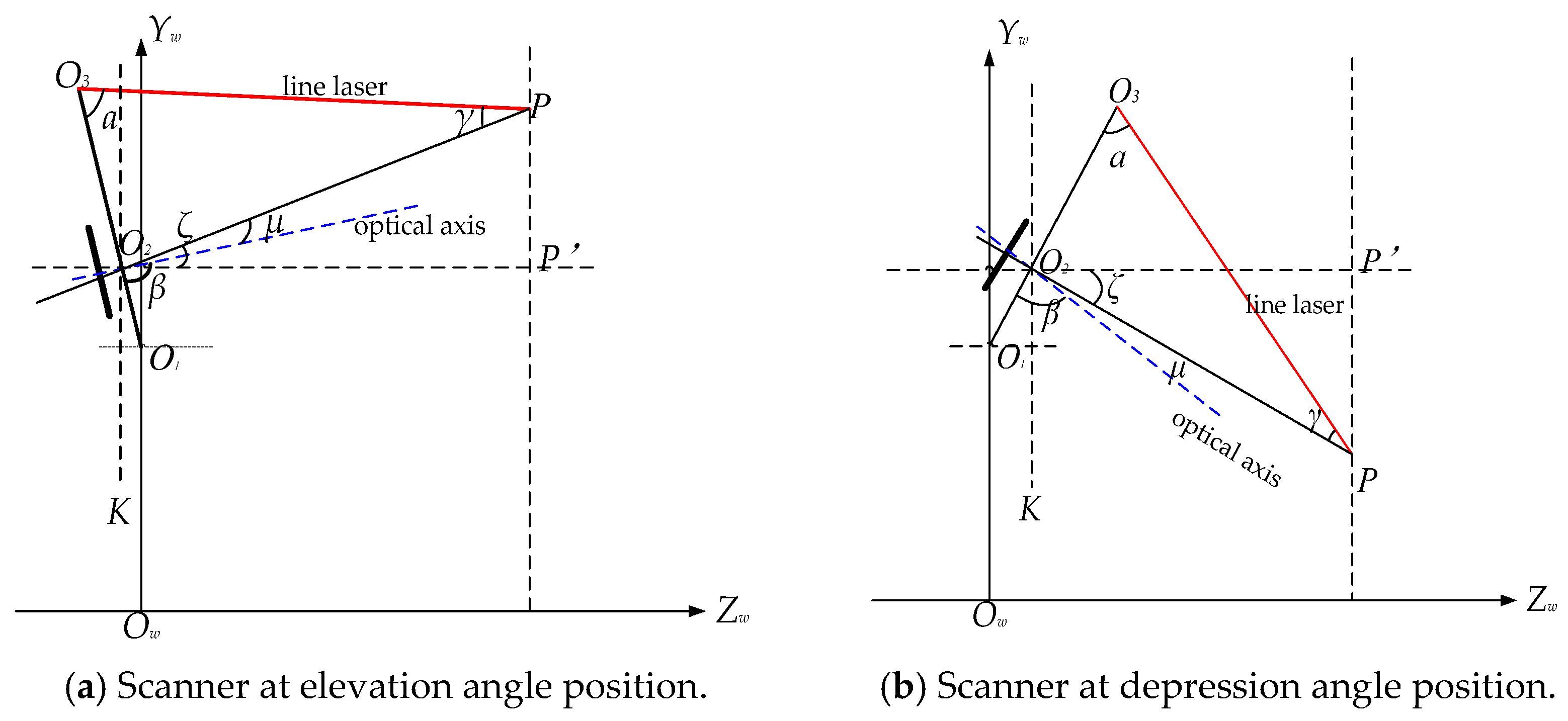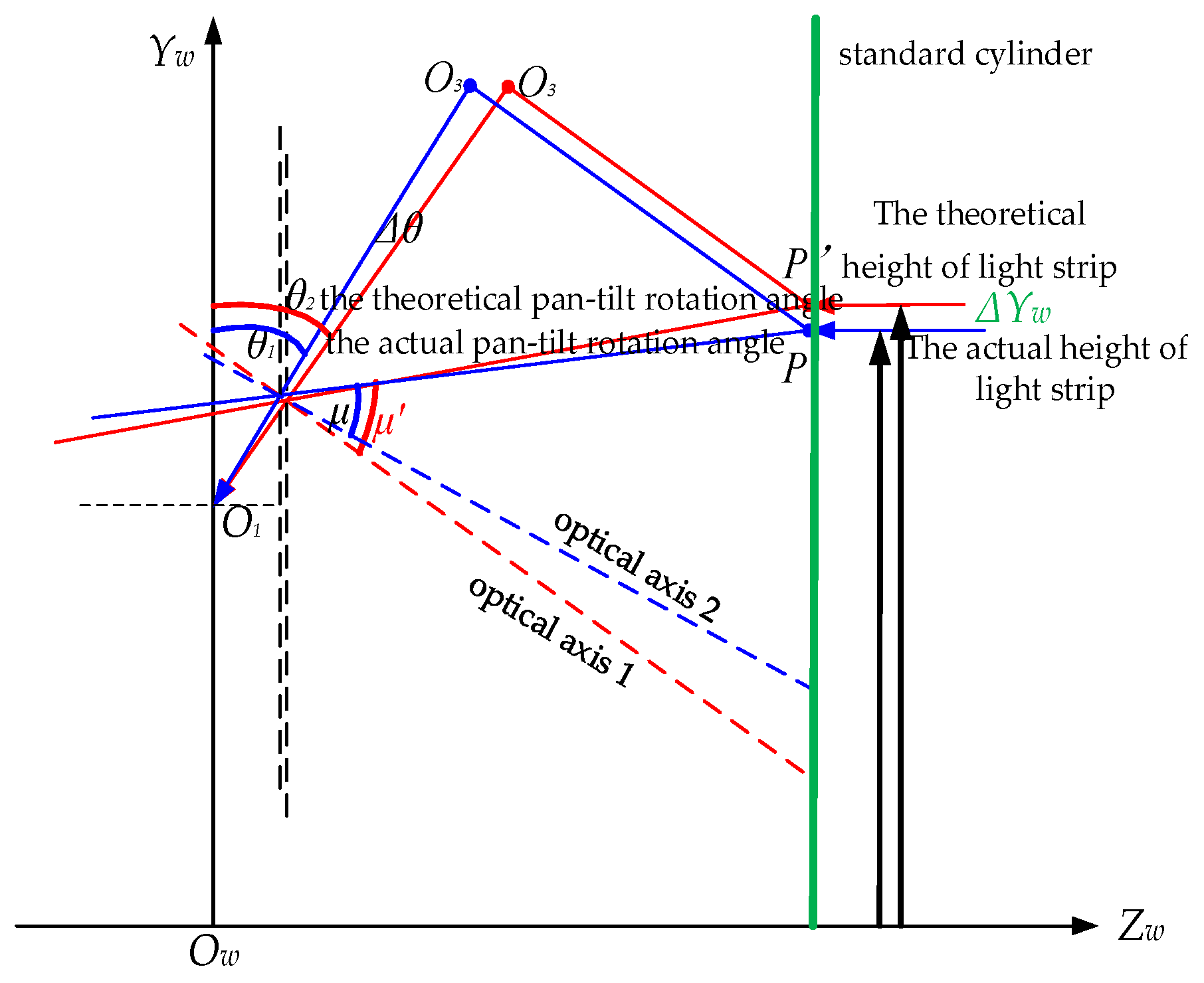 - θ: The rotation angle of the pan-tilt, which represented the angle between the rotating arm (O1O3) and the positive direction of the YW axis in the world coordinate system;