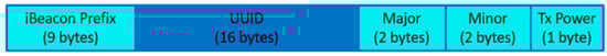 Bluetooth Low Energy (BLE) is widely used for low-power, short-range localization in industrial IoT applications [8,9,13]. BLE beacons are small devices that transmit signals at regular intervals according to defined protocols. The two most common protocols are iBeacon and Eddystone, with iBeacon developed by Apple Inc., Los Altos, Kalifornia in 2013. While the exact data format may vary slightly across manufacturers, all iBeacons share core elements ensuring interoperability, as illustrated in Figure 2: