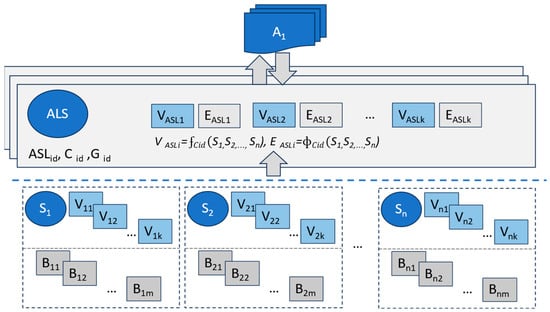 where VALSi denotes the processed values derived from the associated sensors (S1, S2, …, Sk) and EALSi represents events triggered according to a predefined state model. The transformation of raw sensor data into ALS values and events is fully dependent on the defined application logic associated with a given application class. This transformation can be formally expressed using the generic functions (), for both cases can be formally defined by Formulas (5) and (6):