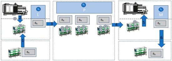 To validate the proposed ALS model, there is a necessity to formalize the transformation functions according to a specific business use case. A simplified material tracking and localization use case with a material flow is therefore selected, as illustrated in Figure 4. In this scenario, material produced by a source production stage machine L (loader) must be transported to a target production stage machine M (feeder), where a material is consumed during the subsequent production of the next article from the input material. The material must be temporarily stored in a transport unit called R (rack). An empty rack must first be connected to the source production machine (1) so that the produced material can be loaded into the rack (2). As soon as the rack is full, it must be disconnected from the machine and moved to the temporary storage area (3). Whenever the target machine needs input material, the rack with the requested material is removed from temporary storage (4) and delivered to the target machine (5). When all material in the rack has been used and unloaded, the empty rack is disconnected from the target machine and delivered to the source machine again (6). Material localization and validation, based on a hybrid solution LoRaWAN/BLE, can be addressed by two different use cases: use case 1 and use case 2.