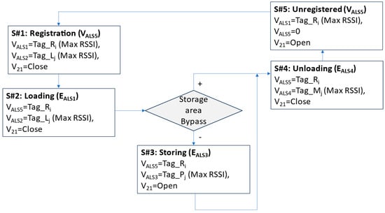 In addition, the ALS concept can also be represented using a state-based model, where each state S#id (registration, loading, storing, unloading, unregistered) has assigned exact values VALSi and events EALSi, as illustrated in Figure 6 and explained in experimental chapter 6, instead of formal definitions for transformation functions ().