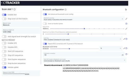 IoTracker 3 configuration is shown in Figure 9. This multi-sensor offers not only the LoRaWAN connection for sending the measured sensor’s values but also additional GPS and Bluetooth configurations. The BLE setting for our experimental test case includes regular scanning every 25 s, with a scanning time of 4 s. The device is configured with filtering according to UUID with the fixed prefix “AAAA”; therefore, only our BLE tag Trax10229 will be scanned and data from the minor and major prefix and RSSI will be transferred within the LoRaWAN up-link message to the application.