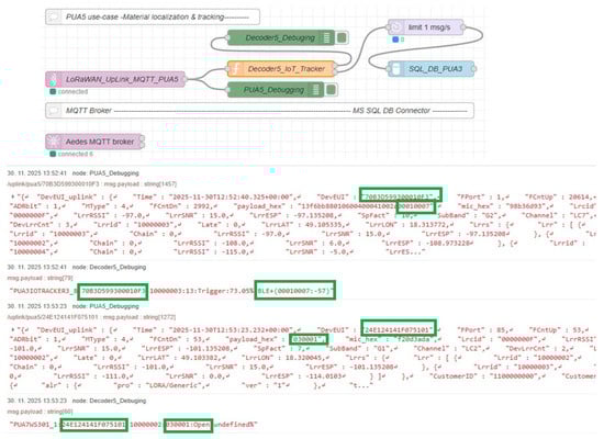 Figure 10 shows examples of up-link messages for both types of sensors. The DevEUI identifier of the specific sensor and essential up-link data (payload_hex) are highlighted in color. In the case of the IoTracker3 sensor, these are BLE iBeacon identifiers (major: 0001, minor: 0007), and the decoder (Decoder5_Debugging) extracts them for processing by the application prior to saving them to the database. The data from the second sensor, WS301, is shown as well with color marking, where the open magnetic contact (open) is coded in payload_hex as “03001”. Conversely, the closed contact (close) would be evaluated in payload_hex as “03000”.
