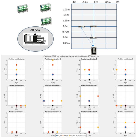 An even more important experiment was to test the probable geometric arrangements (tag positioning) of the racks relative to each other and the machine input feeder. In total, we tested the 12 most common combinations of tag positions (marked as A, B, …, L scenarios) according to the location of the racks, as shown in Figure 13.