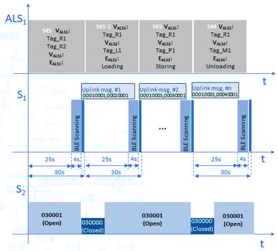 To validate our model, we re-tested the three racks using the transformation function and state diagram, as shown in Figure 14. The LoRaWAN sensor S1 scans BLE tags periodically every 25 s, and the scanning time is set to 4 s. In the case of detection of a BLE tag, the sensor consequently sends an up-link message containing the scanned iBeacon identifiers sorted by RSSI. The number of iBeacon identifiers in one up-link message is limited to three, according to the assumptions explained in use case2. This setting then generates regularly up-link messages with a period of 30 s. In addition, LoRaWAN sensor S2 is checking the status of the magnetic switch; while it was open, the last up-link message contained the value “030001”. As soon as the magnetic switch is closed, the up-link message is sent containing the value “030000”. The Associated LoRaWAN Sensor (ALSi) combines the values of both sensors and calculates from sensor values the new logical values VALSi and events EALSi. The experiment starts with two BLE tags in proximity to S1 (0001001, 0001002), which are translated by ALS1 as Tag_R1 and Tag_R2. Then the carrier is moved to the vicinity of the source machine L1, identified by the tag (00020001, Tag_L1). Once the carrier is inserted into an output material loader and the magnetic switch is closed, then the carrier is registered as VALS5 = Tag_R1 (00010001), and event EALS1 = “Loading“ is generated. The process continues after the carrier is moved from source machine L1 to storage position P1. ALS recalculates values VALS3 = Tag_P1 (00030001) and generates event EALS3 = “Storing”. Finally, when the rack is moved from storage to the destination machine M1, the magnetic switch is closed. ALS recalculates values VALS4 = Tag_M1 (00040001) and generates event EALS4 = “Unloading”, while the carrier is unregistered VALS4 = “”.