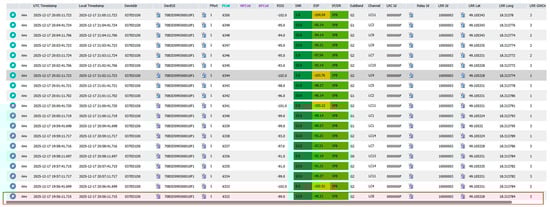 Examples of LoRaWAN up-link messages from the Actility ThingPark OCP server are shown in Figure 17, and the marked message (Counter Fcnt: 6332) is linked with the ALS model processed experimental values in Figure 18.