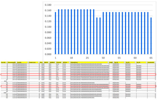 In total, we processed 65 LoRaWAN up-link messages during the experiment, as shown in Figure 18, including a graph with the LoRaWAN up-link message air time. Only one message (FCnt: 6372) was lost during the experiment (marked in the table in Figure 18), which gives a packet loss of 1.5%. Since we limited the maximum number of iBeacon identifiers to three, according to our use case 2 case, the length of the messages ranged between 40 and 60 characters, which influenced the up-link message air time as shown on the graph. Similar to use case 1, we noticed a localization error according to RSSI, when instead of the nearest tag, Tag_R1 (00010001), the machine tags Tag_L1 (00020001), Tag_M1 (00040001) appeared first, as shown in Figure 18; however, the ALS model kept localization without failure due to the registration process and the magnetic switch sensor. Table 1 summarizes all statistics from our ALS model experimental validation.