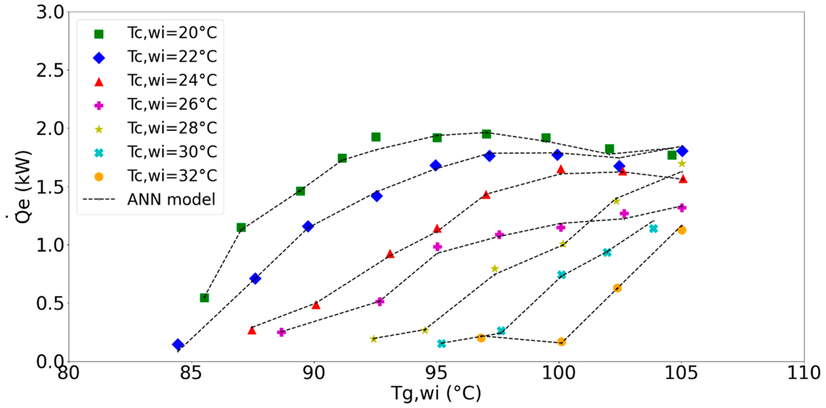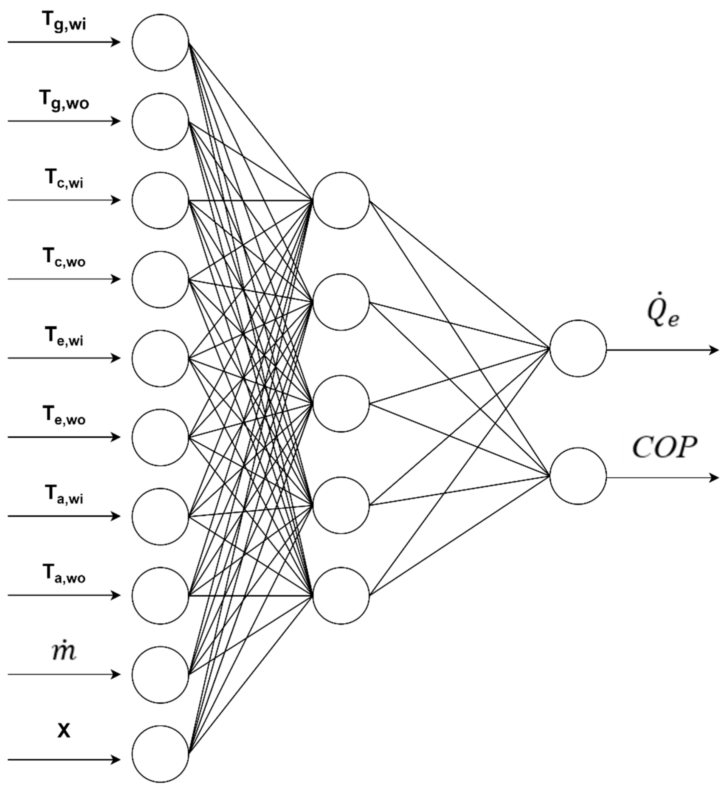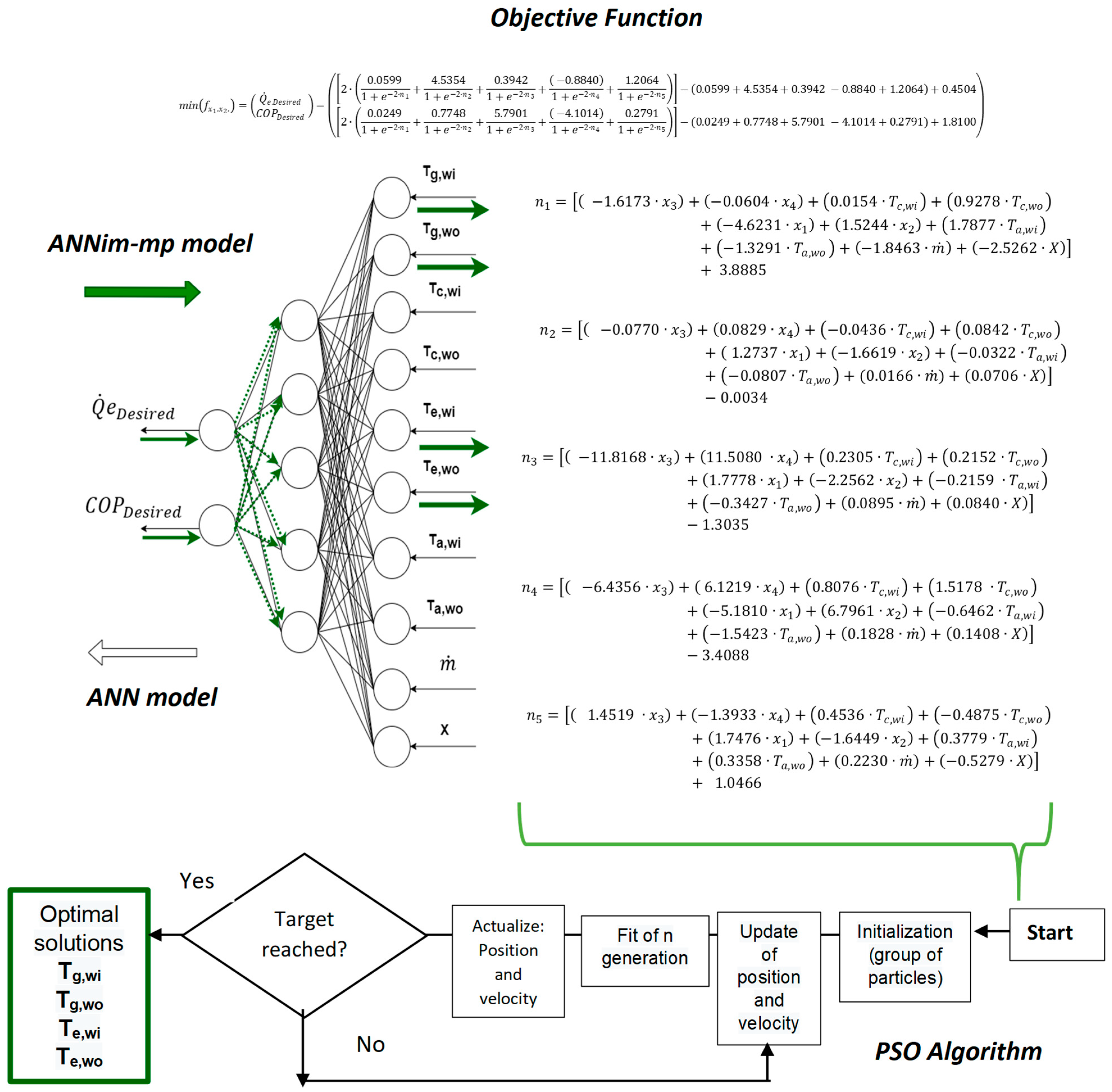 In summary, the main contributions of this study can be outlined as follows. First, an optimization methodology based on a multi-output inverted neural network was developed and applied to a new context, improving the parallel efficiency of the absorption cooling system. Second, an objective function was proposed to simultaneously maximize and COP under actual operating conditions. Third, the influence of input variables on the system’s performance was analyzed and validated through the implementation of an artificial neural network. Finally, it was demonstrated that the ANNim-mp methodology, when solved using the PSO algorithm, can generate reliable projections under different experimental conditions for effective control of the absorption cooling system.