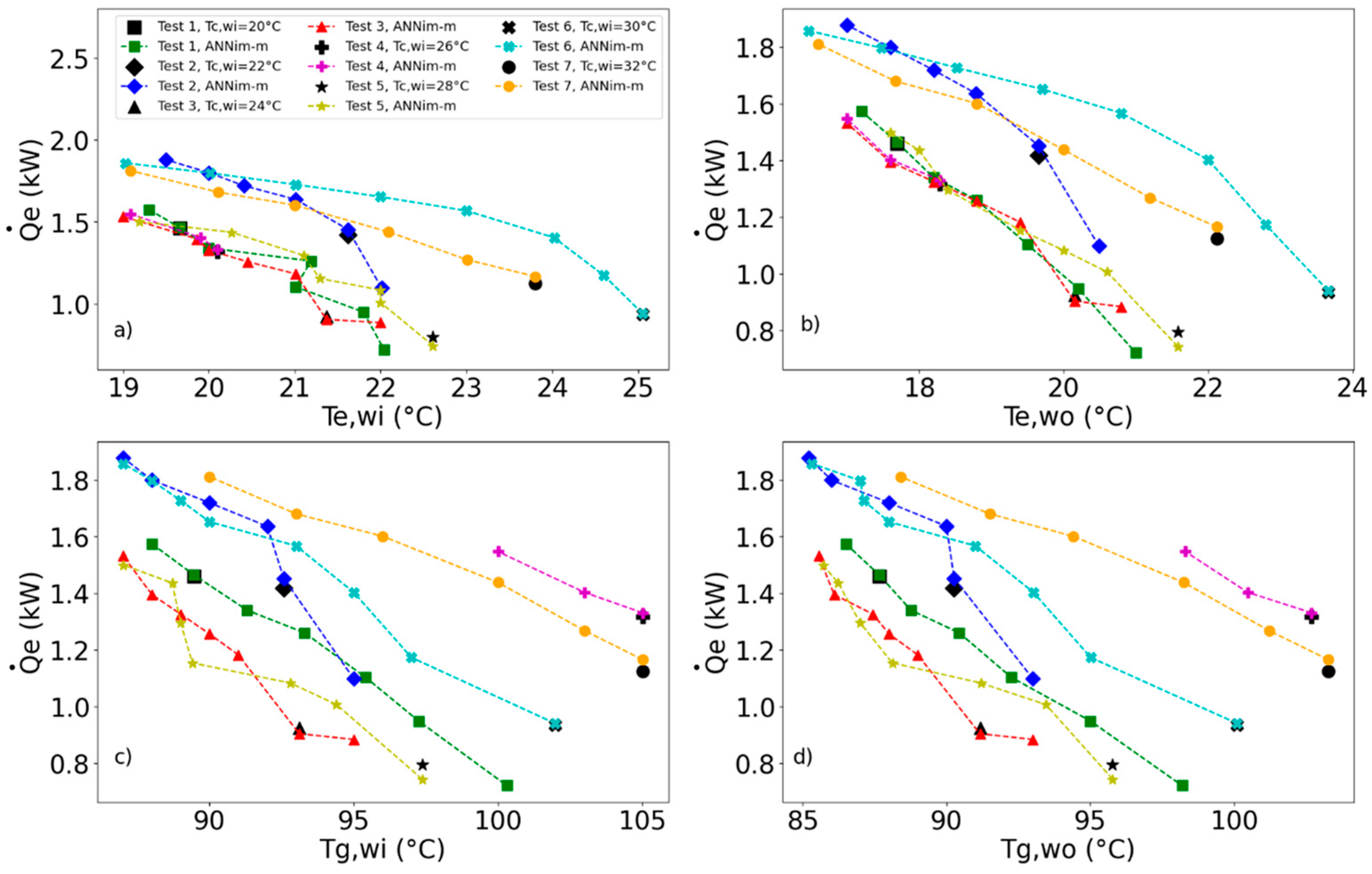 Figure 9a,b, the black marks indicate the values obtained experimentally, while the marks and lines in color indicate the results obtained from the optimization for each of the seven tests. During system testing, all of the operative parameters were kept constant. Optimization was carried out by changing the evaporation temperatures.