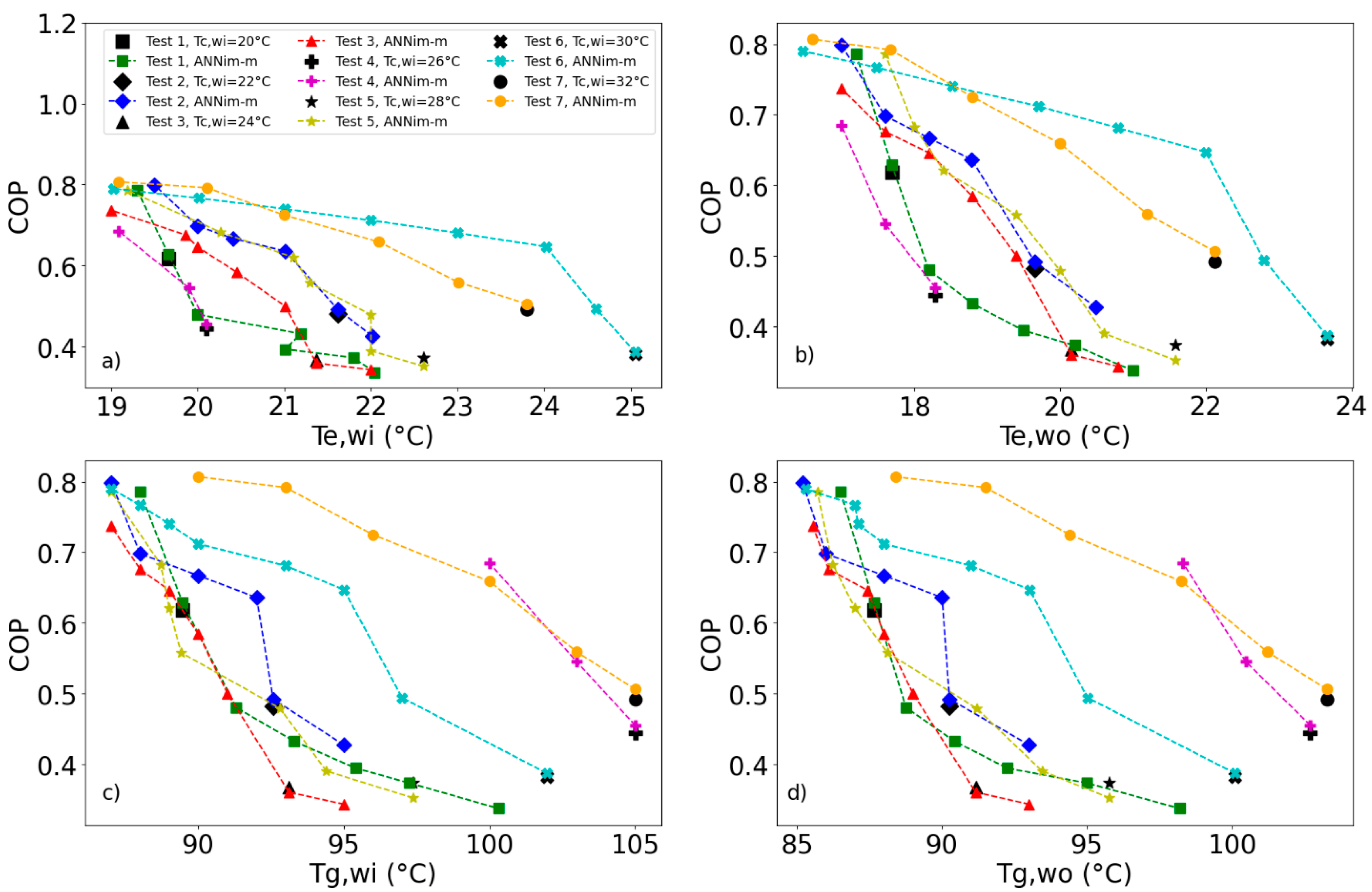 COP is optimized as a function of the generator temperatures, better values are obtained for test no. 7. This occurs because temperatures