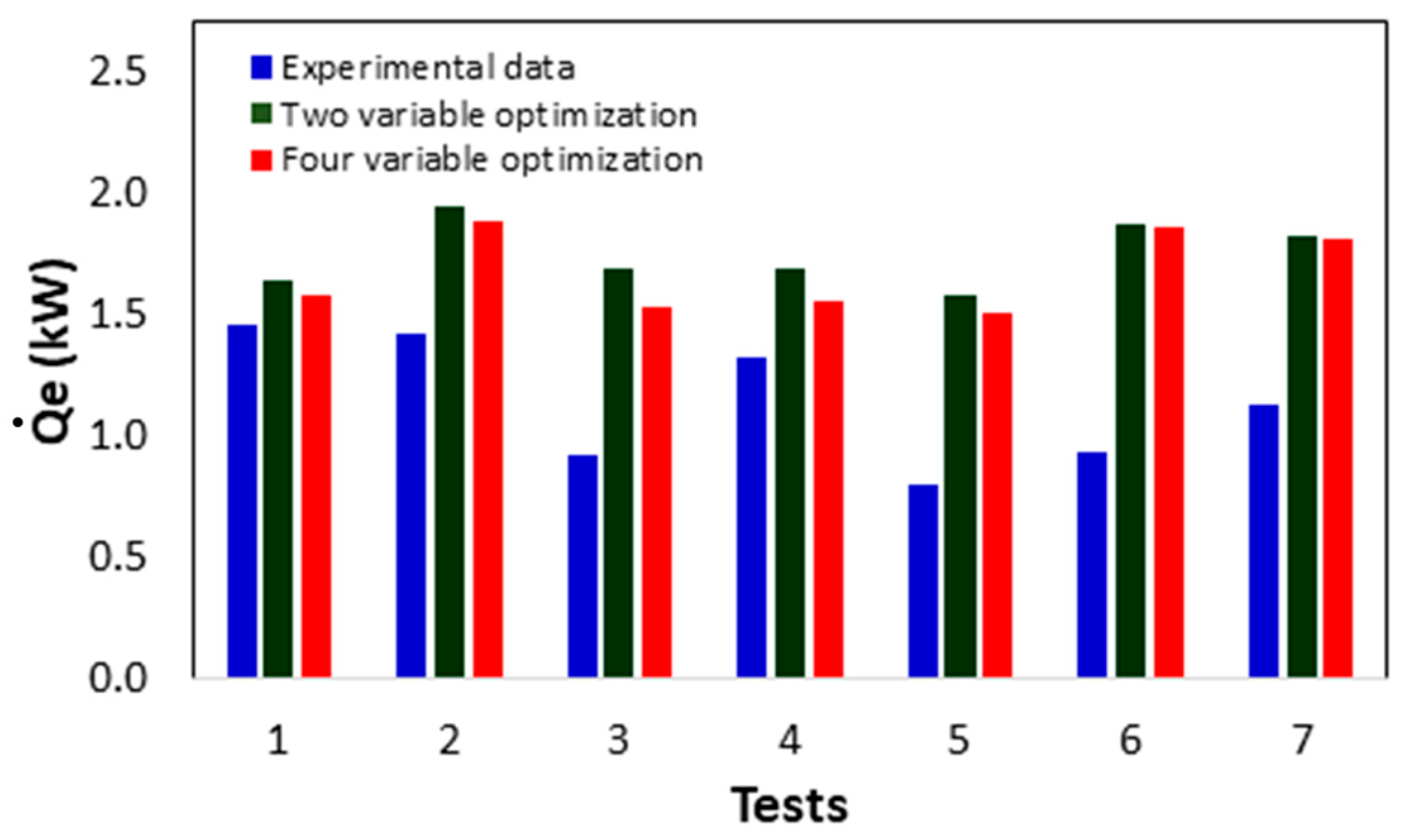 values obtained experimentally with those obtained from the optimization process. The values represented by the green and red bars (corresponding to the two- and four-variable optimizations) refer to the maximum value obtained at different temperatures in the evaporator and generator, respectively. It can be observed that for all the tests, with both optimization processes, it is possible to achieve better cooling load values, demonstrating the convenience of the optimization analysis. For test no. 1, at the lowest generation temperature (