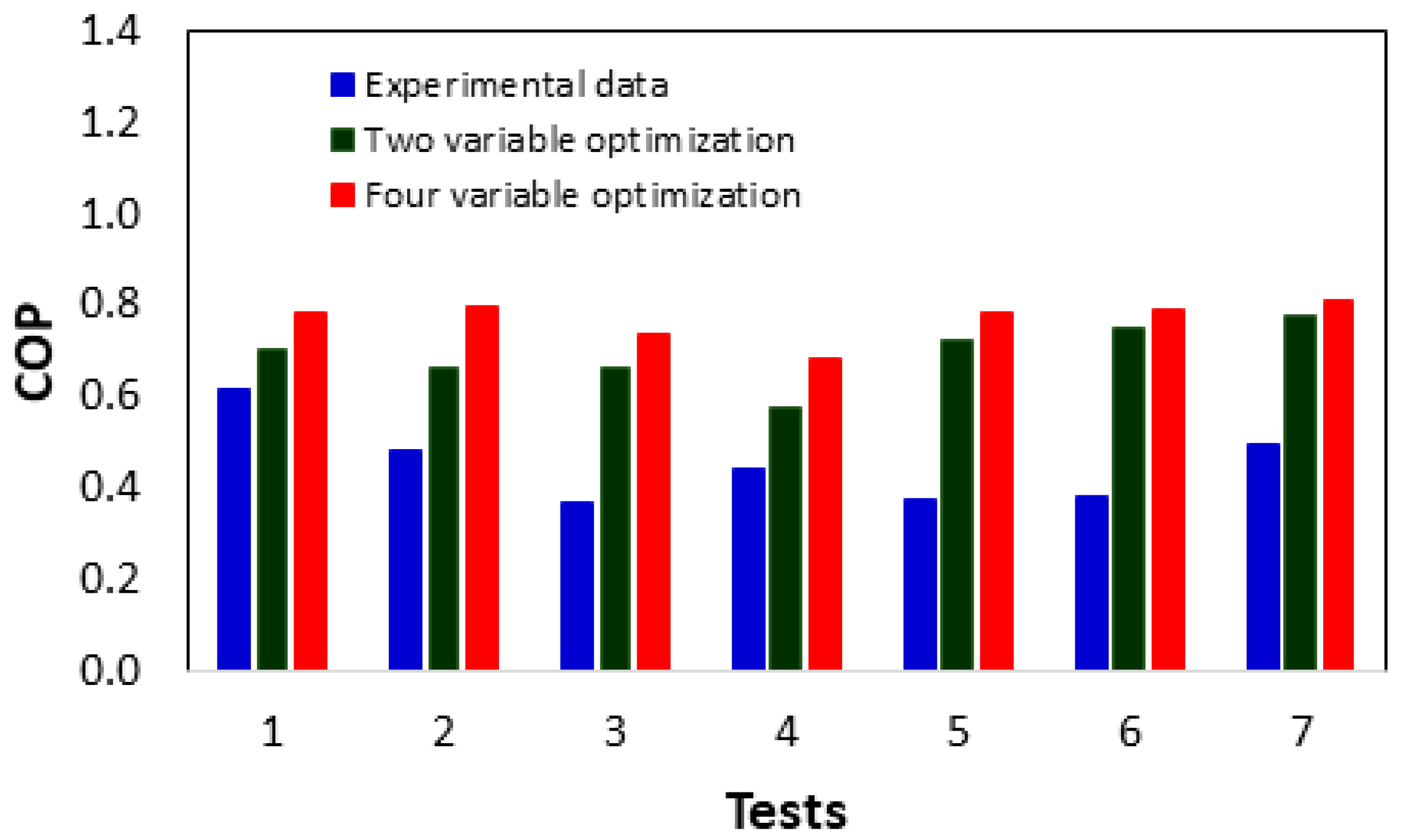 COP values in comparison to those obtained with the two-variable analysis, varying from 27% up to 111%. Experimental test no. 6 achieved the best simultaneous increase in