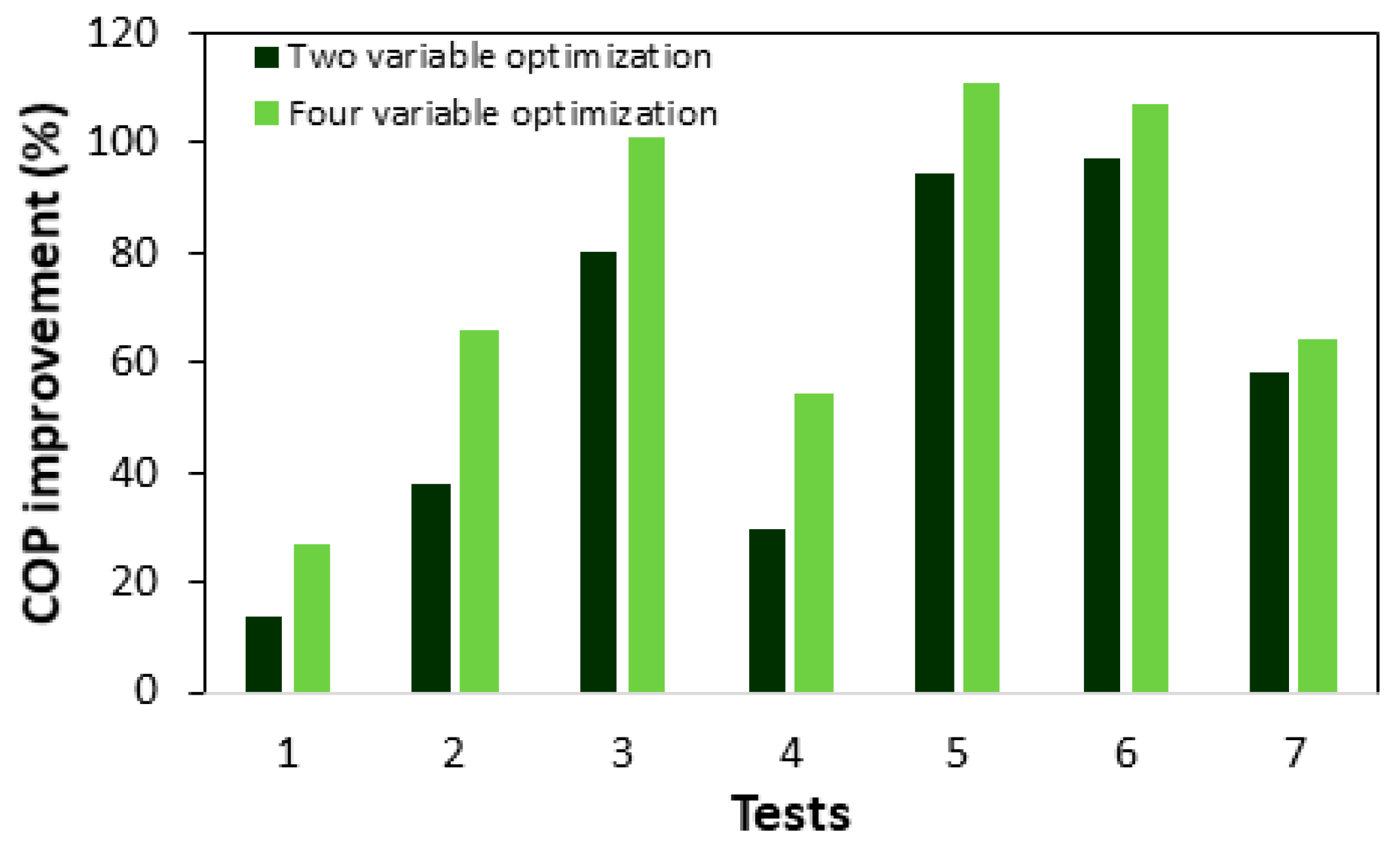 COP when employing optimization with two and four variables. It is seen that there is high variability in the improvement percentage for the analyzed tests, varying from 13% up to 97.1%, when optimizing two variables at the same time. However, it can be observed that with the four-variable optimization, it is possible to achieve higher
