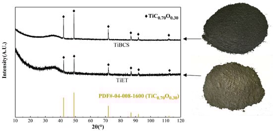 Figure 1 shows the X-ray diffraction patterns of TiBCS and TiET. In comparison with TiBCS, the diffraction peak intensity of the TiC0.70O0.30 phase in TiET is significantly reduced. The calculation yielded a percentage decrease in diffraction peak intensity of 69.87% (calculated based on the strongest diffraction peak). However, the incomplete disappearance of its diffraction peak also indicates the presence of an unreacted TiC0.70O0.30 phase in TiET.