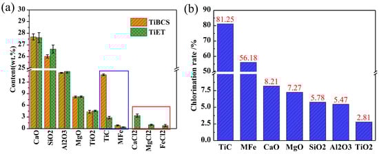 Table 2 presents the composition and content of TiET formed by TiBCS following the chlorination reaction process. It is estimated that approximately 8% by mass is lost following chlorination of TiBCS to form TiET during the production process. Consequently, by integrating the composition alterations depicted in Table 1 and Table 2, the chlorination rates of each constituent can be determined. As illustrated in Figure 3, the alterations in the composition of each constituent of the slag are demonstrated before and after the chlorination reaction (Figure 3a), along with the chlorination rate (Figure 3b).
