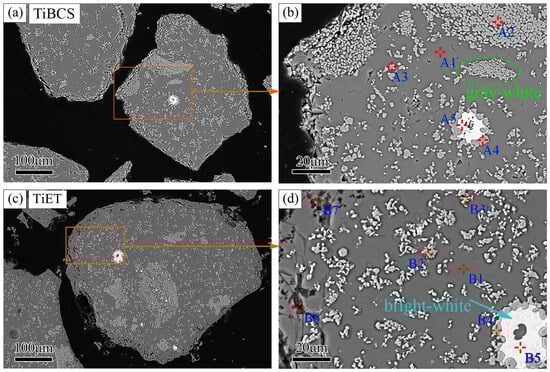 TiBCS and TiET particles are dispersed and solidified with epoxy resin to reveal the evolution of particle internal structures before and after chlorination. The subsequent process involves the exposure of the internal structure through grinding and polishing, followed by observation through backscattered electron imaging (BSE) under a scanning electron microscope, as illustrated in Figure 5. Table 3 and Table 4 present the energy-dispersive X-ray spectroscopy (EDS) point analysis for the elemental composition of TiBCS and TiET.