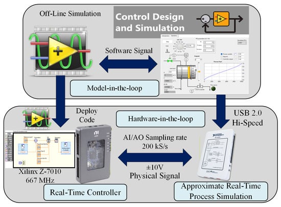 To address this issue, Hardware-in-the-Loop (HIL) simulation has emerged as an effective and promising approach that combines real-time process simulation with physical control hardware. HIL offers a safe, cost-efficient, and educational platform for hands-on learning and testing, bridging the gap between academic knowledge and industrial practice to help future engineers meet the demands of Industry 5.0. While HIL has become popular in engineering areas such as aerospace, electric vehicles, power electronics, robotics, and renewable energy [10,11,12,13,14], its use in control systems engineering remains limited. Most laboratory studies focus on simple processes or linear models [15,16,17]; these support the teaching of basic concepts but fall short in real-world industrial training because they do not adequately illustrate differences among systems. In contrast, many HIL platforms cannot simulate a wide range of processes, which limits their use for advanced control instruction. Consequently, students still face a gap between theory and practice. A flexible, easy, safe, and cost-effective HIL platform for process control education remains lacking, as learners need tools to study both linear and nonlinear, as well as multivariate dynamics, as observed in industry.