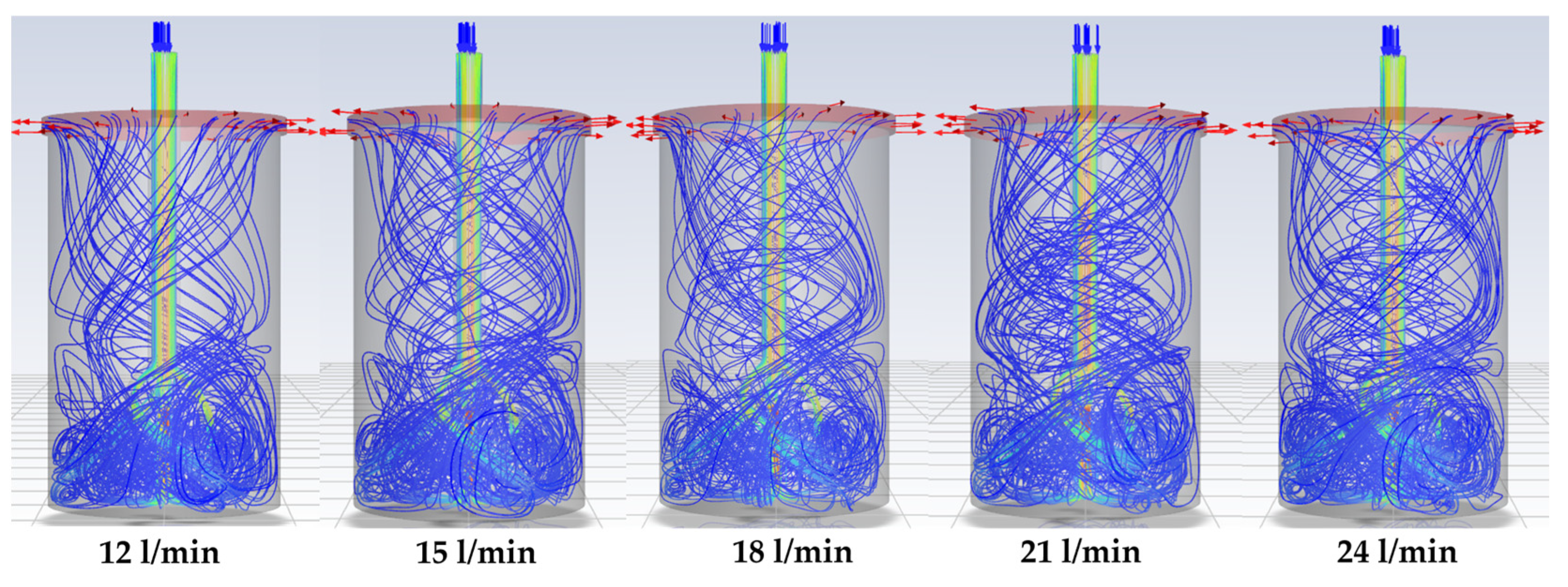 - Yan, X.; Liu, J.; Cao, Y.; Wang, L. A single-phase turbulent flow numerical simulation of a cyclonic-static micro bubble flotation column. Int. J. Min. Sci. Technol. 2012, 22, 95–100. [Google Scholar] [CrossRef]