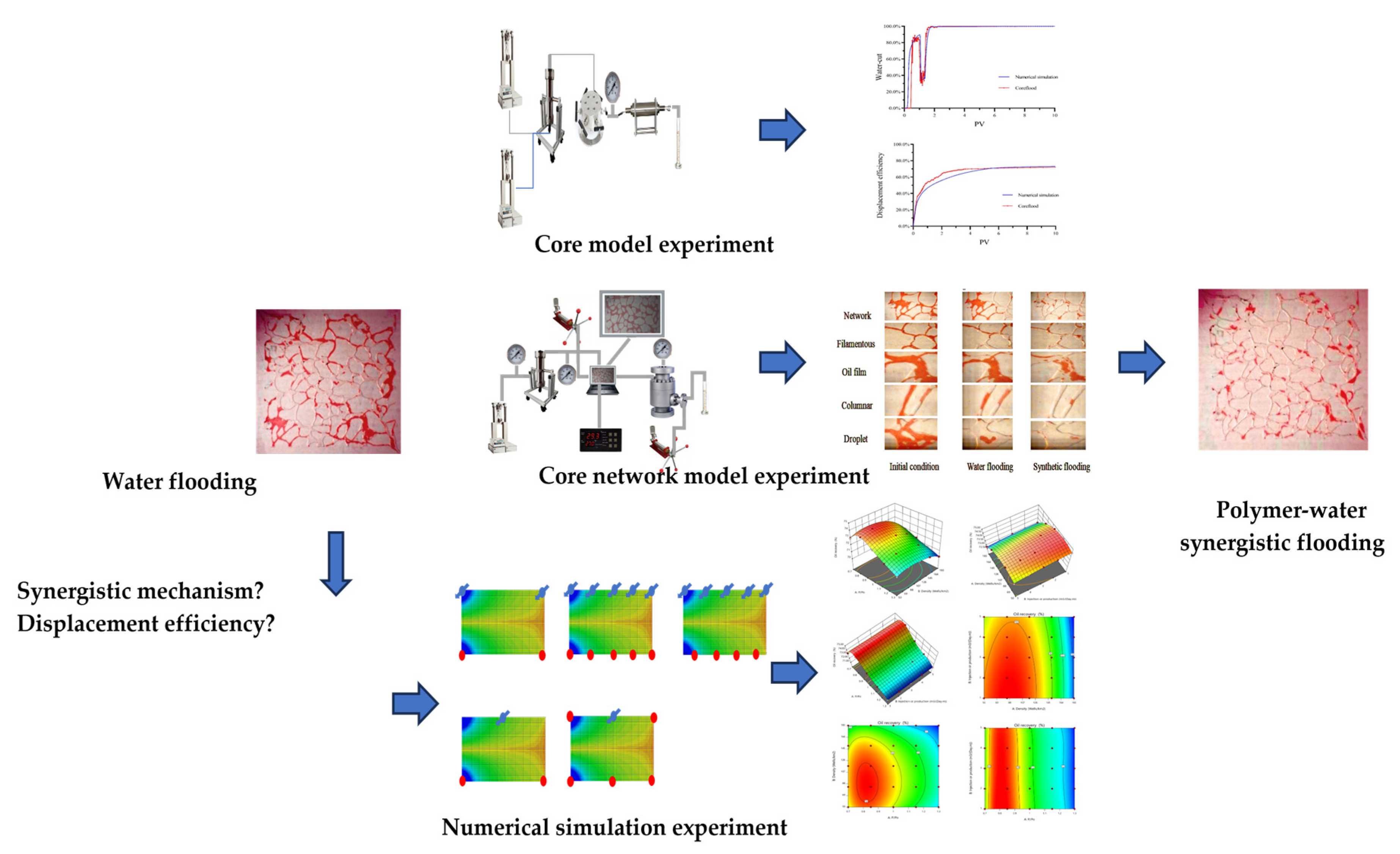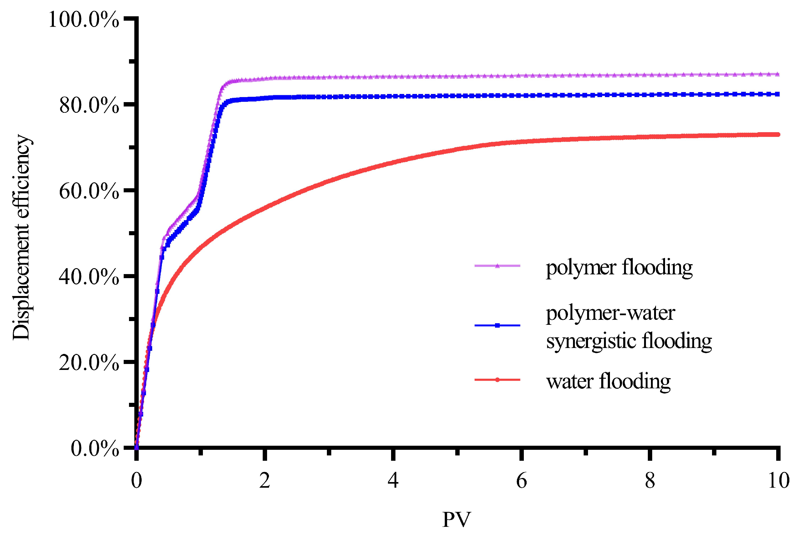 Comparison of displacement efficiency among water flooding, polymer–water synergistic flooding, and polymer flooding.