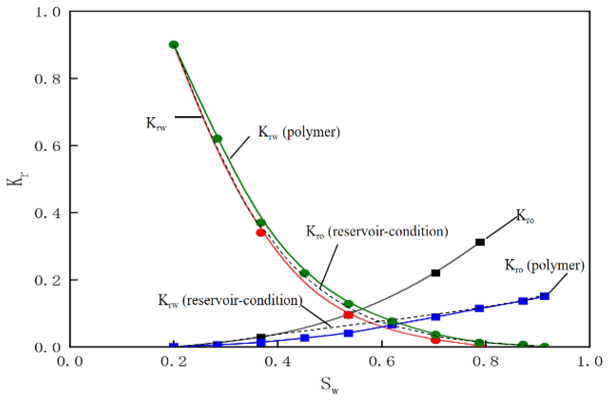 The relative permeability curves for different flooding methods.
