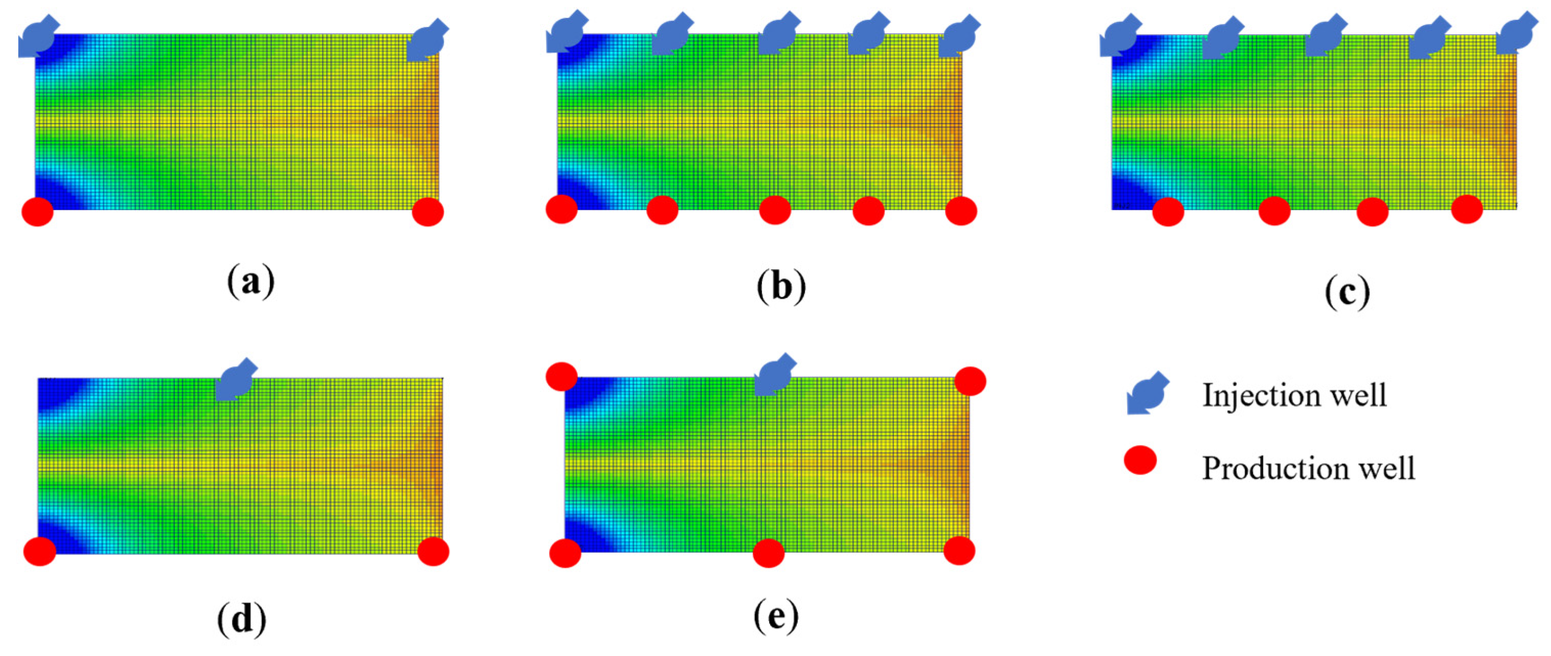 Schematic diagram of oil and water well distribution. (a) Schematic diagram of initial pattern. (b) Direct line drive diagram. (c) Staggered line drive diagram. (d) Five-spot diagram. (e) Nine-spot diagram.