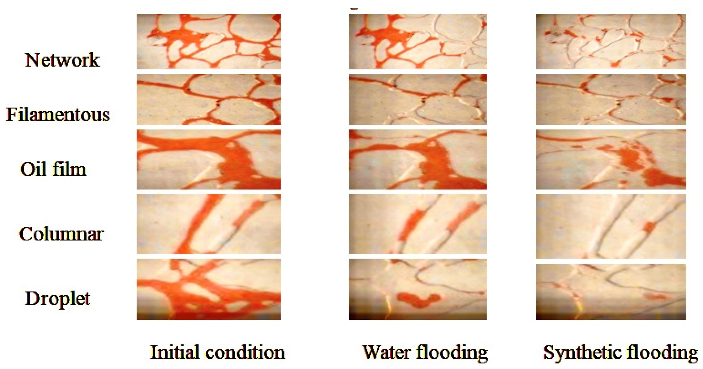 The microscopic residual oil distributions after water flooding and polymer–water synergistic flooding.