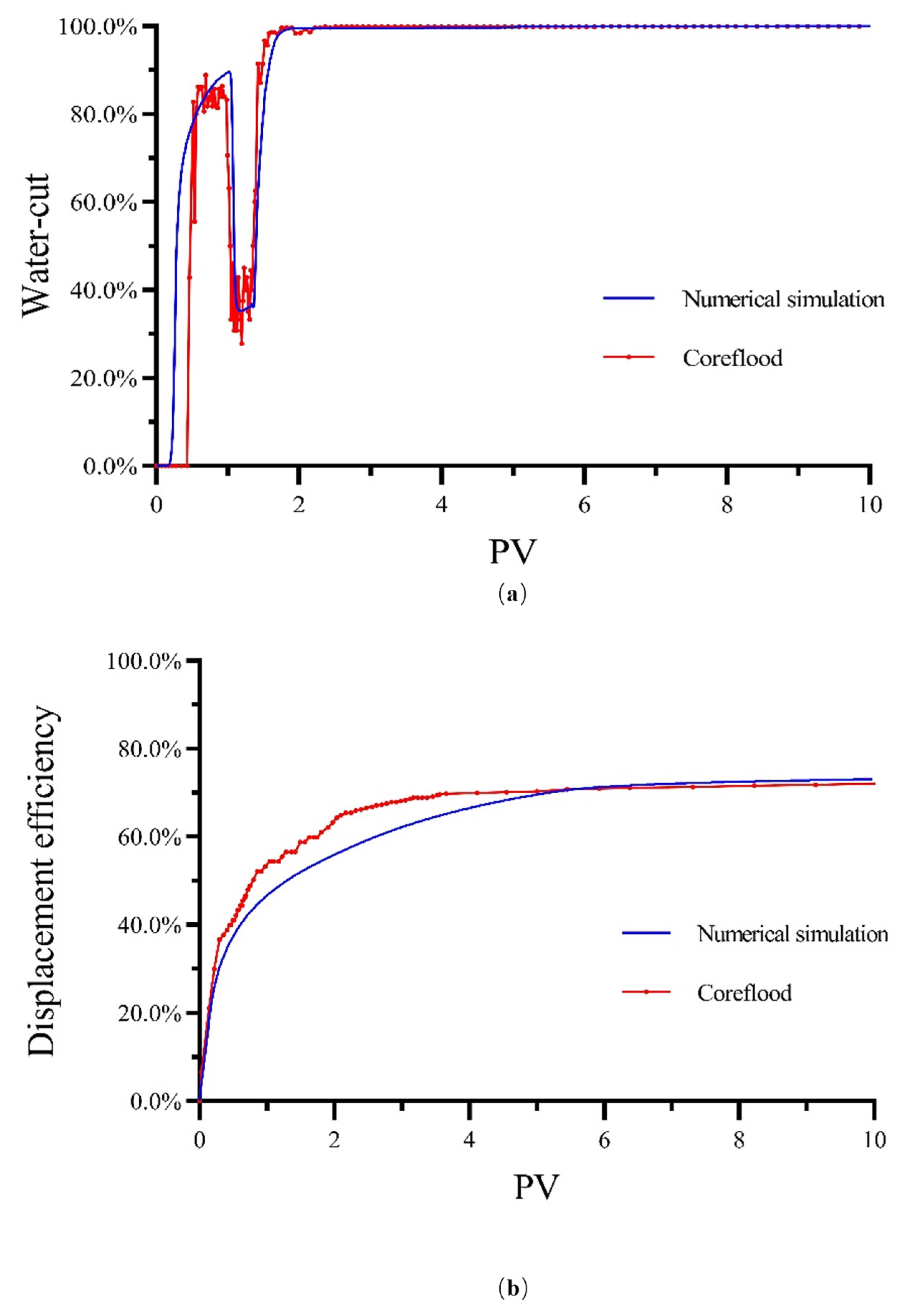 (a) The water-cut relation between coreflood and the numerical simulation of the water flooding experiment. (b) The displacement efficiency relation between coreflood and the numerical simulation of the water flooding experiment.