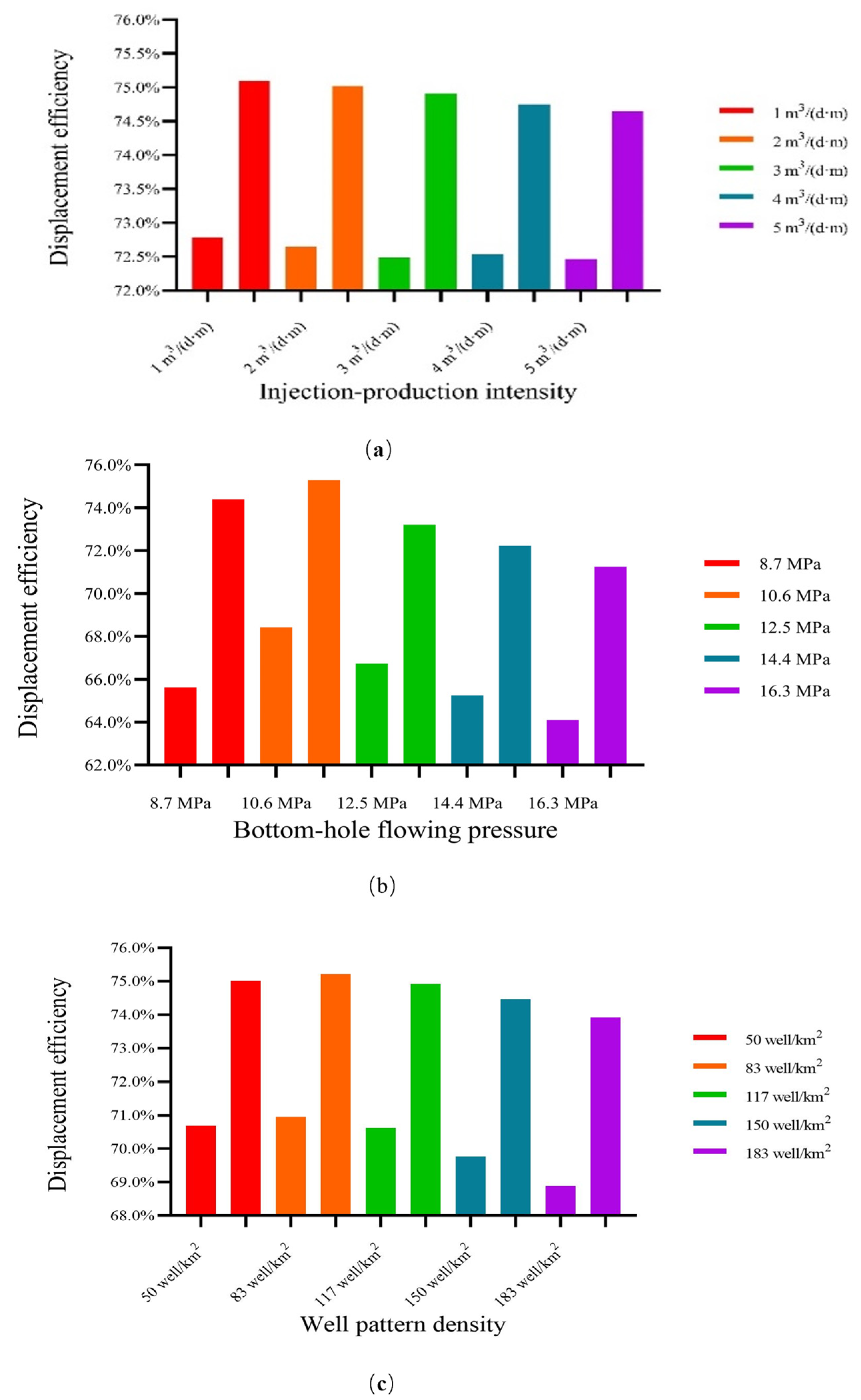 The displacement efficiency of water flooding and polymer–water synergistic flooding in different development strategies. (a) Injection–production intensity. (b) Bottom-hole flowing pressure. (c) Well density.