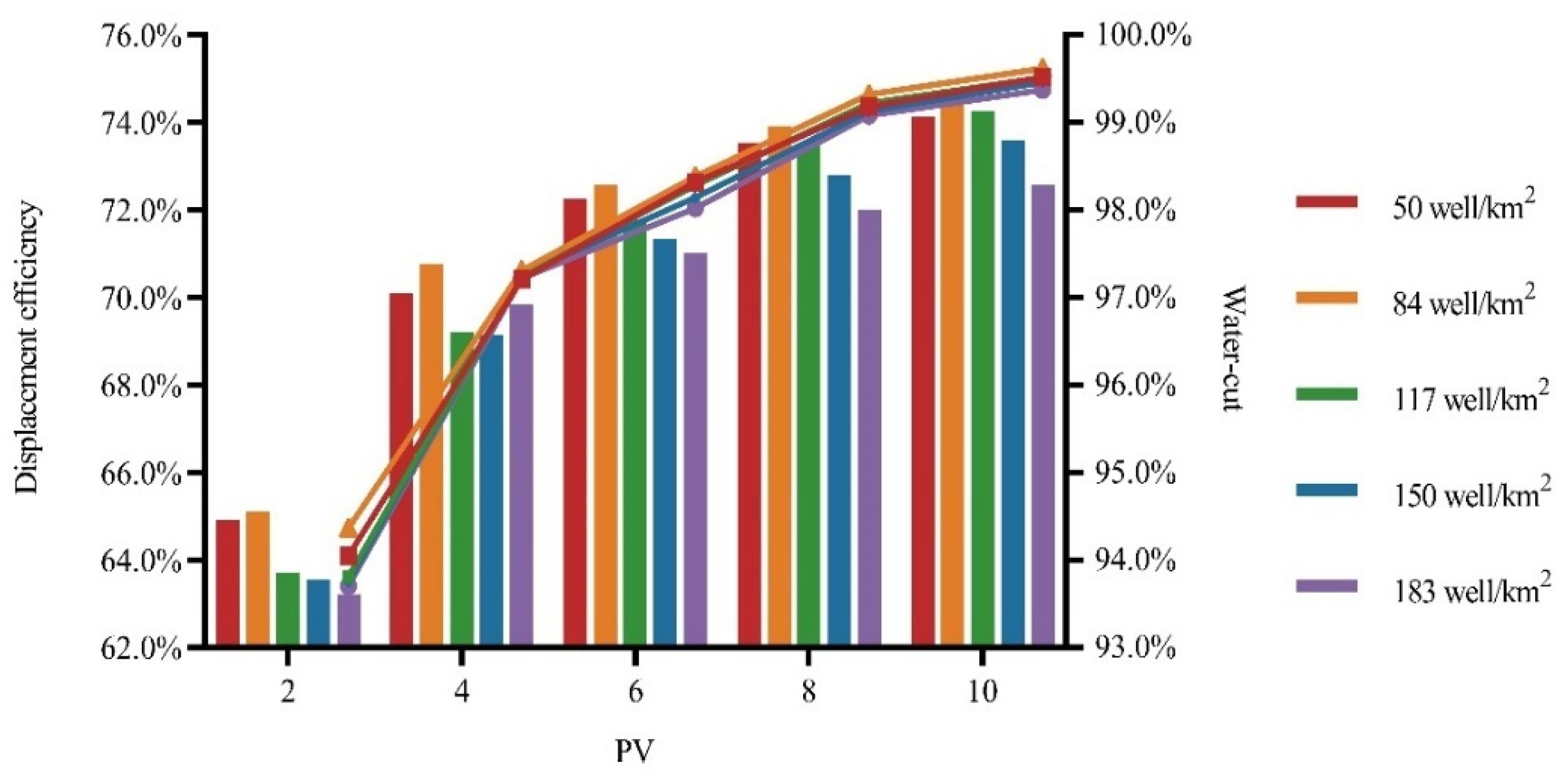 The relation between water cut and displacement efficiency with well pattern density (comparison of displacement efficiency by column chart; comparison of water cut by scatter diagram).