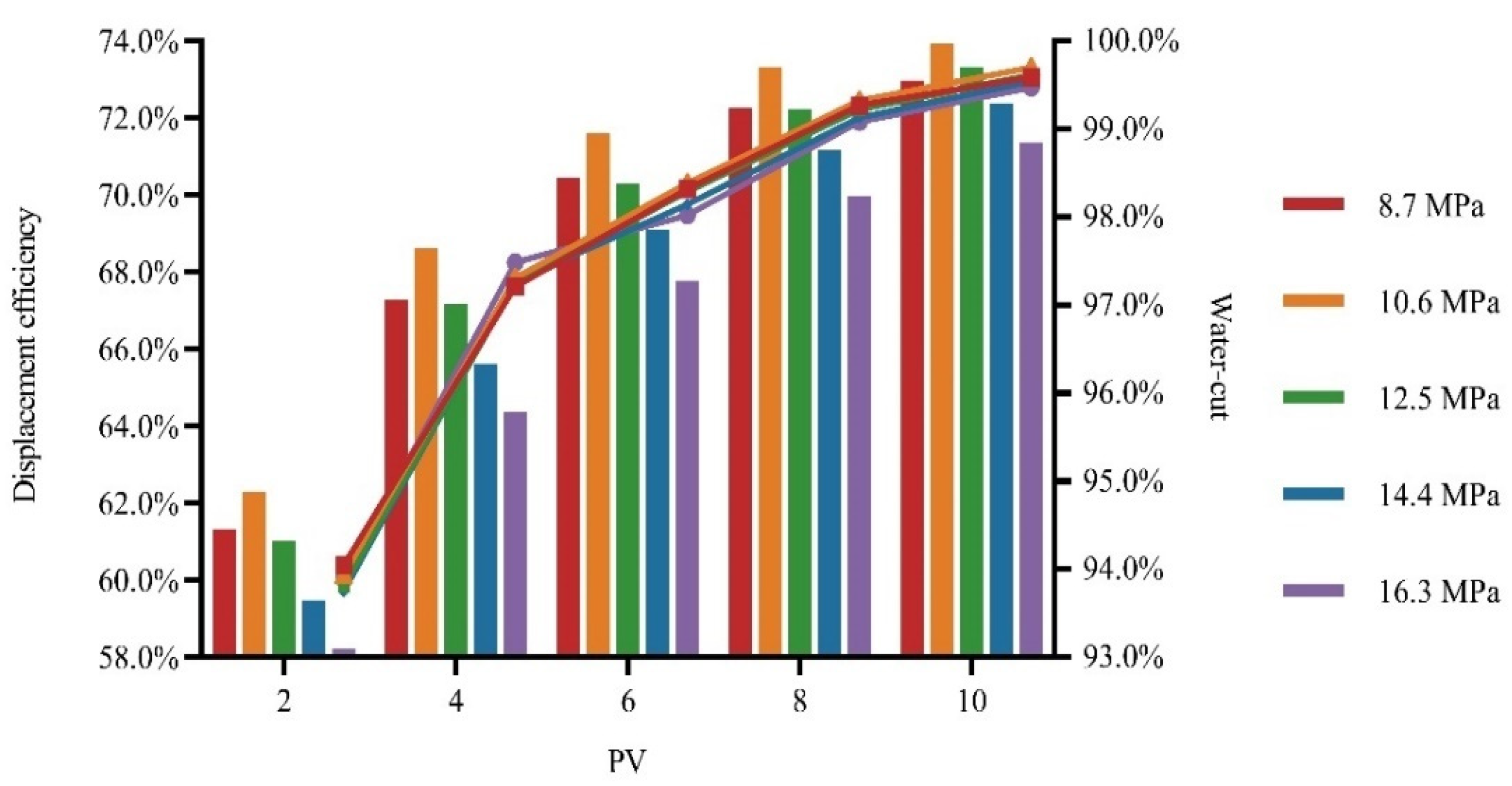 The relation between water cut and displacement efficiency with bottom-hole flowing pressure (comparison of displacement efficiency by column chart; comparison of water cut by scatter diagram).
