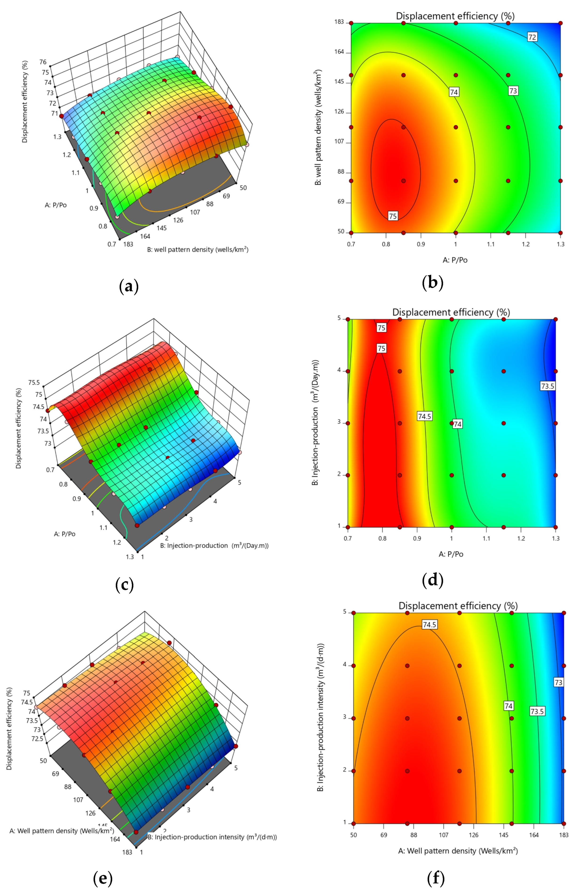 Two-factor synergistic comparison of development strategies. (a) Well pattern density and bottom-hole flowing pressure response surface. (b) Well pattern density and bottom-hole flowing pressure contour plot. (c) Bottom-hole flowing pressure and injection–production intensity response surface. (d) Bottom-hole flowing pressure and injection–production intensity contour plot. Well pattern density and injection–production intensity contour plot. (e) Well pattern density and injection–production intensity response surface. (f) Well pattern density and bottom-hole flowing pressure contour plot.